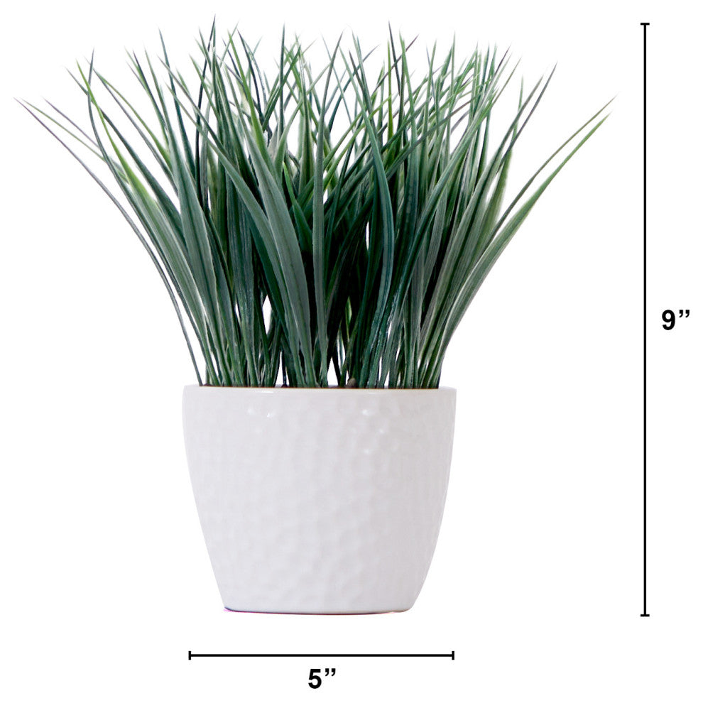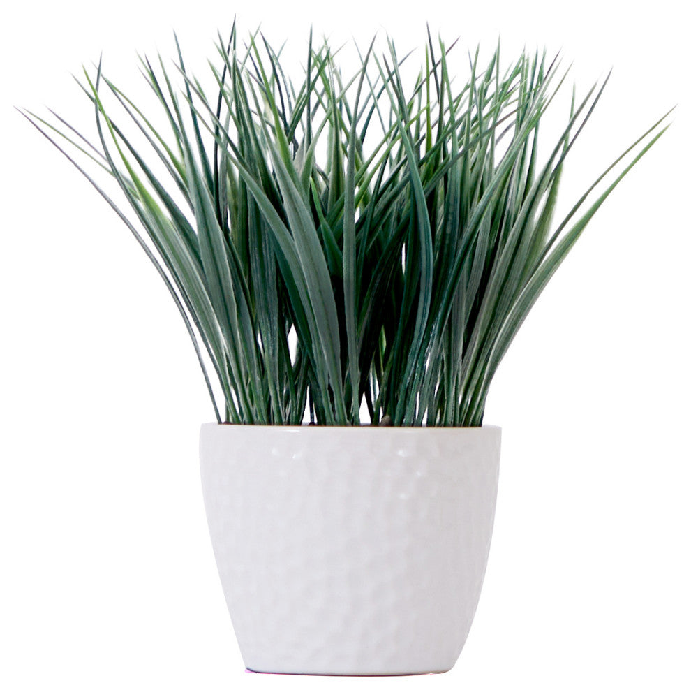 Are you bored with your current office setup? Brighten up your space by adding an artificial grass plant that is sure to enliven any nook. Inspired by nature, the spiky leaves add visual interest. The plant is crafted from high-quality materials by expert horticulturists, and you can see the details in every corner. Standing 9" tall in a white decorative planter, it can be displayed in any space. Makes a great gift for any friend.