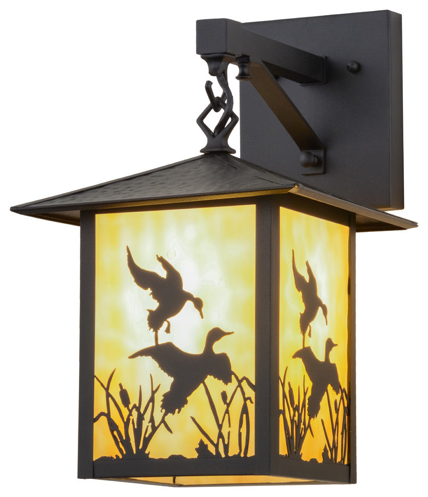 Handcrafted of Solid Brass, Ducks splash and fly among the cattails and marsh grasses in this wildlife inspired original lighting fixture. Beautiful ambient lighting is projected through Beige art glass with the hardware and decorative accents featured in a Black finish. This sconce is handmade in the USA by Meyda artisans in the Yorkville, NY manufacturing facility, which is located at the foothills of the glorious Adirondack Mountains. Wildlife and other custom designs are available, as well as dimmable energy efficient lamping options.