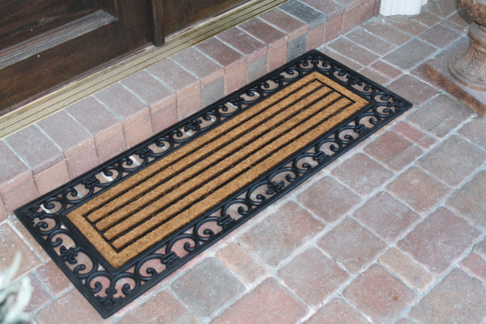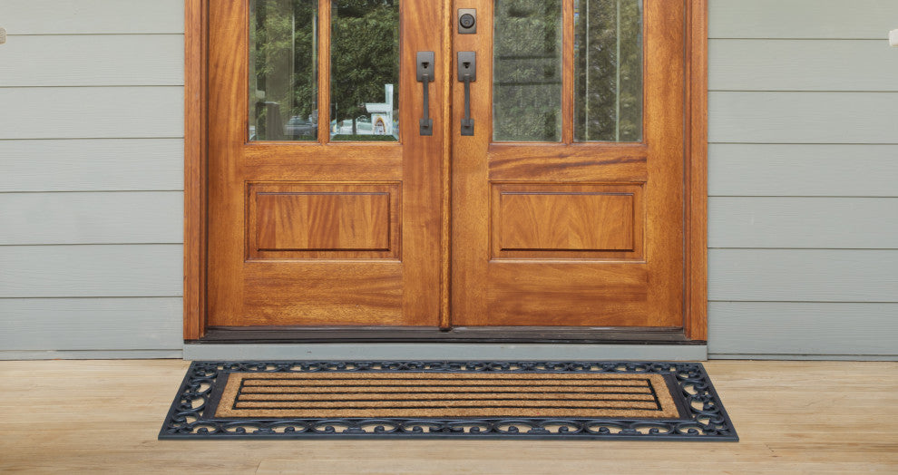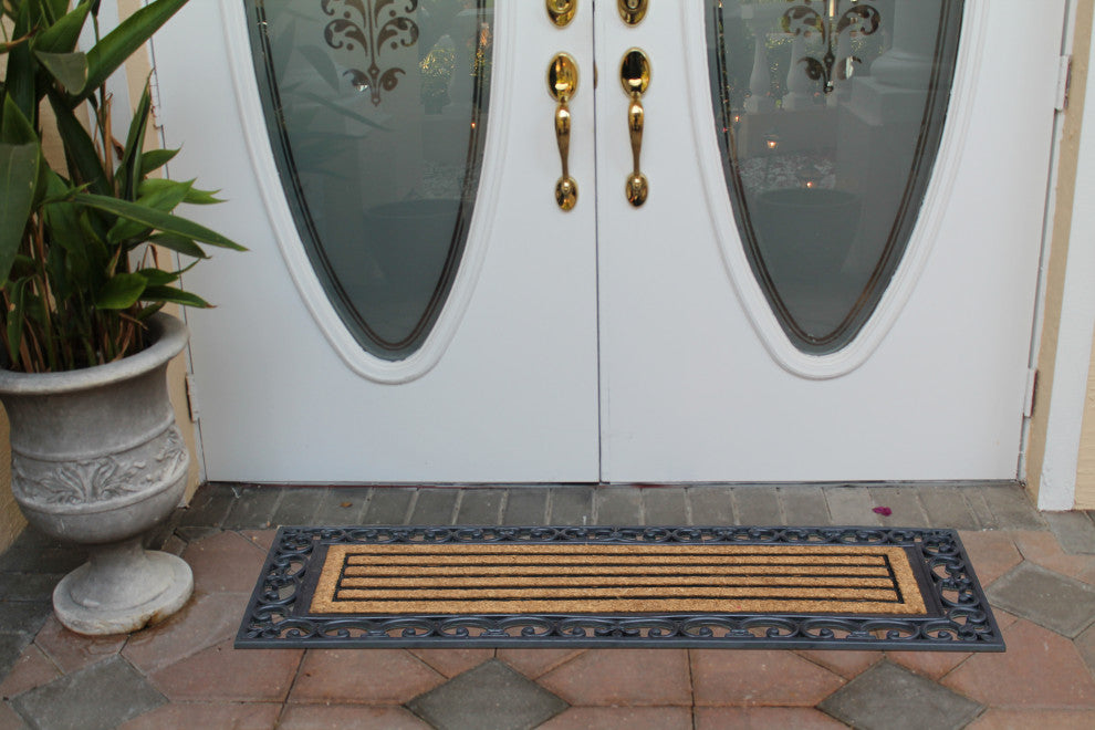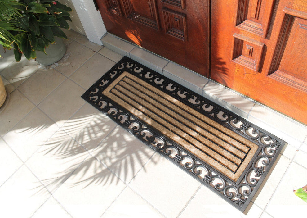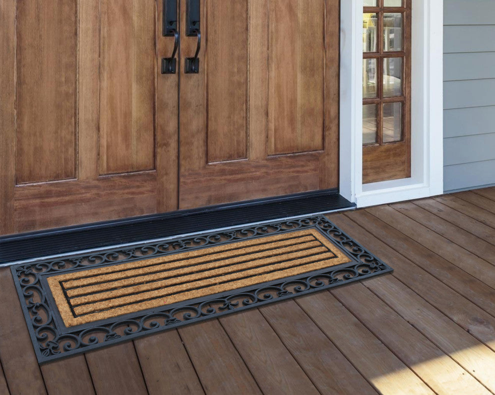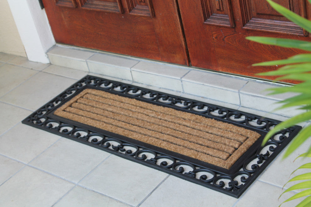Accent your doorway with this ultra-chic and stylish door mat. Crafted of all-natural rubber and coir, this mat is an excellent decorative accent for your doorway and it also help remove dirt, debris, mud and moisture from your shoes. This transitional style black large size rubber molded coir brush doormat is the perfect way to spruce up your floors and home decor while maintaining a level of practicality. These mats are made from renewable natural materials - coir and rubber and are environment friendly and biodegradable.>100% COCONUT COIR FIBER - Natural fiber face provides the perfect surface for guests to wipe their shoes before entering your home.>HEAVY-WEIGHT MOLDED RUBBER BORDER firmly anchors the mat in place.>PLACE BEFORE EVERY EXTERIOR DOOR - Use on a patio, in a garage, laundry room, entryway, and anywhere there is high traffic from outside.Use in covered outdoor areas.>PERFECT SIZE FOR YOUR LARGE ENTRYWAY - Doormat measures 48" x 18" and is 0.6" thick to allow your door to easily pass over the mat without getting stuck.>DECORATIVE DESIGN: adds a unique touch to your front door or back door while being very functional.