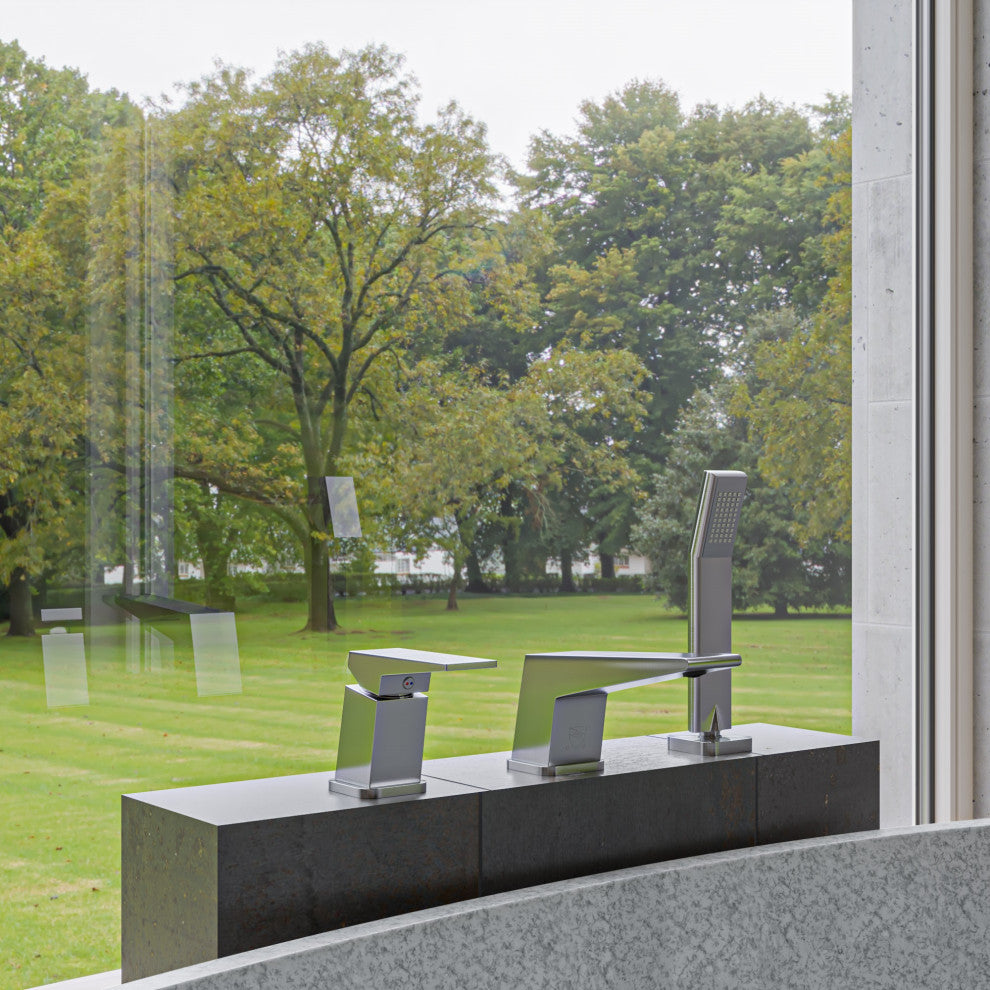 Single lever handle and sleek thin showerhead give this tub filler a modern look.
