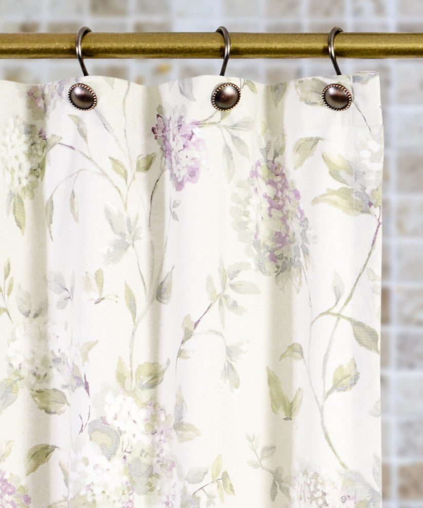 Bring the gorgeous sights of Spring indoors. Our traditional hydrangea pattern on high quality fabric will drape beautifully and bring a breath of fresh air into the entire room. Abigail is a multi colored traditional Hydrangea floral print pattern on solid natural colored ground that features a range of shades and colors that coordinate easily with a variety of solids and patterns within your home. Made with 52-percent polyester/48-percent 5-ounce cotton fabric creates a smooth draping effect, soft texture and easy maintenance. The Shower Curtain measures 72-inches wide and is 72-inches long from top to bottom of panel. One shower curtain will fit a standard size shower and will require 12 shower curtain rings to hang. Matching Abigail Valances, Panels and Tiers also available . Machine washable.