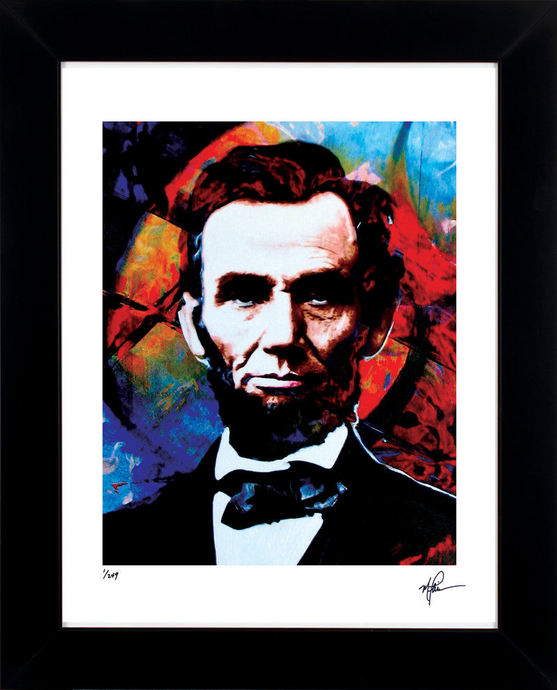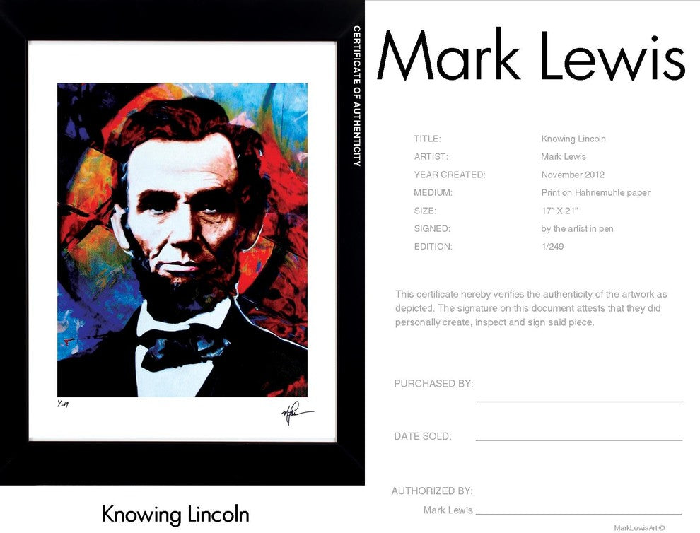 Abraham Lincoln "Knowing Lincoln" by artist Mark Lewis. Lewis is a living relative of Denton Cy Young the legendary baseball player and Baseball Hall Of Fame recipient. This collectible limited edition art is titled "Knowing Lincoln" The subject is Abraham Lincoln. The complete edition Size is 249. Each piece of artwork will be delivered with a "Certificate of Authenticity" Mark Lewis, a renowned artist from southern California, has created his first giclee, print and poster series now available to the public. Born Mark Alan Holmes in Akron, Ohio, raised in Charter Oak, California, Marks'' career path has certainly been an eventful one. After serving honorably in the United States Navy Lewis then delved into the performing arts. He spent years as a successful actor, appearing in numerous movies and television programs. Ultimately turning his focus to painting, Lewis brought his expansive life adventures, raw talent and inspiration to the canvas. Lewis instills an immense beauty and creativity in the work that flows from his palette. He achieves that rare feat among artists of creating an unspoken dialog between artist and viewer in his work. Lewis'' paintings, prints and posters have been exhibited in numerous galleries throughout the U.S.MEDIUM: This art is a fine art print on Vibrance Baryta paper. Hand signed and numbered by the artist Mark Lewis. ( This artwork is not a poster )SPECIFICS: Frame Size - 25" x 21" Art Print Edition Size - Limited Edition of 249 - The number delivered will be randomCERTIFICATION: This art is delivered with a signed and dated Certificate of AuthenticityFRAMING: This art is framed in a black 2 1/2" frame and ready to hang in your home