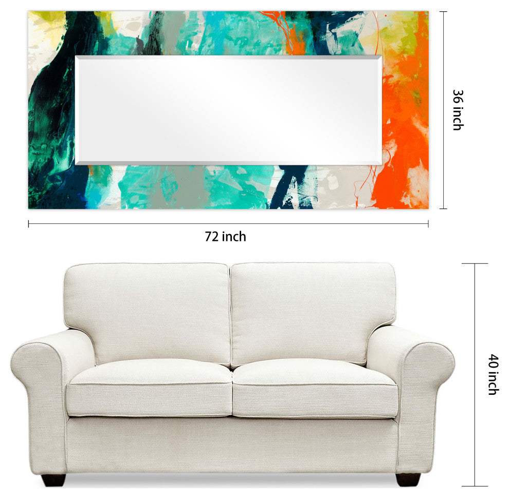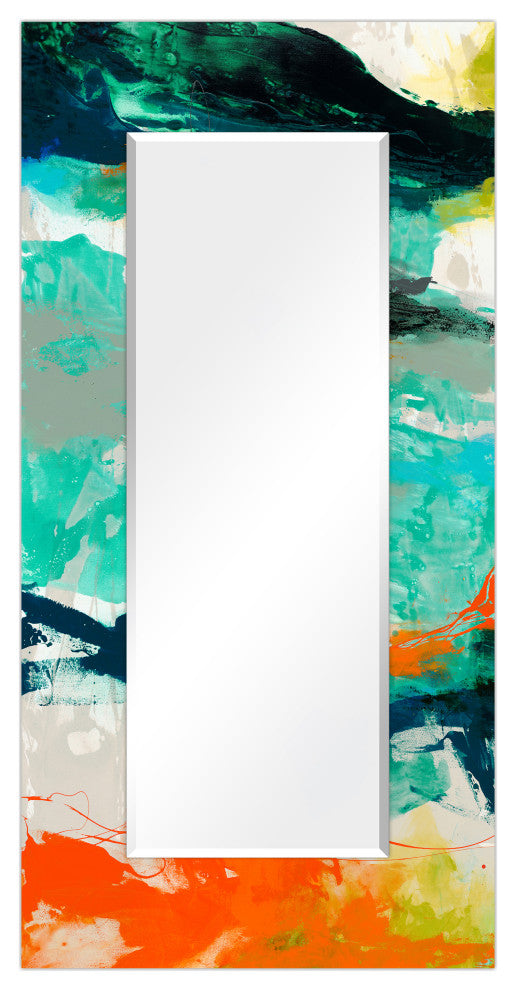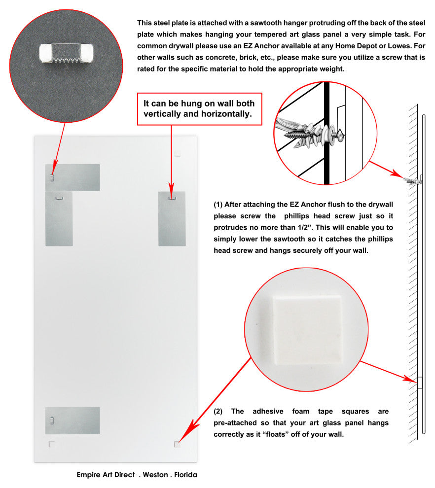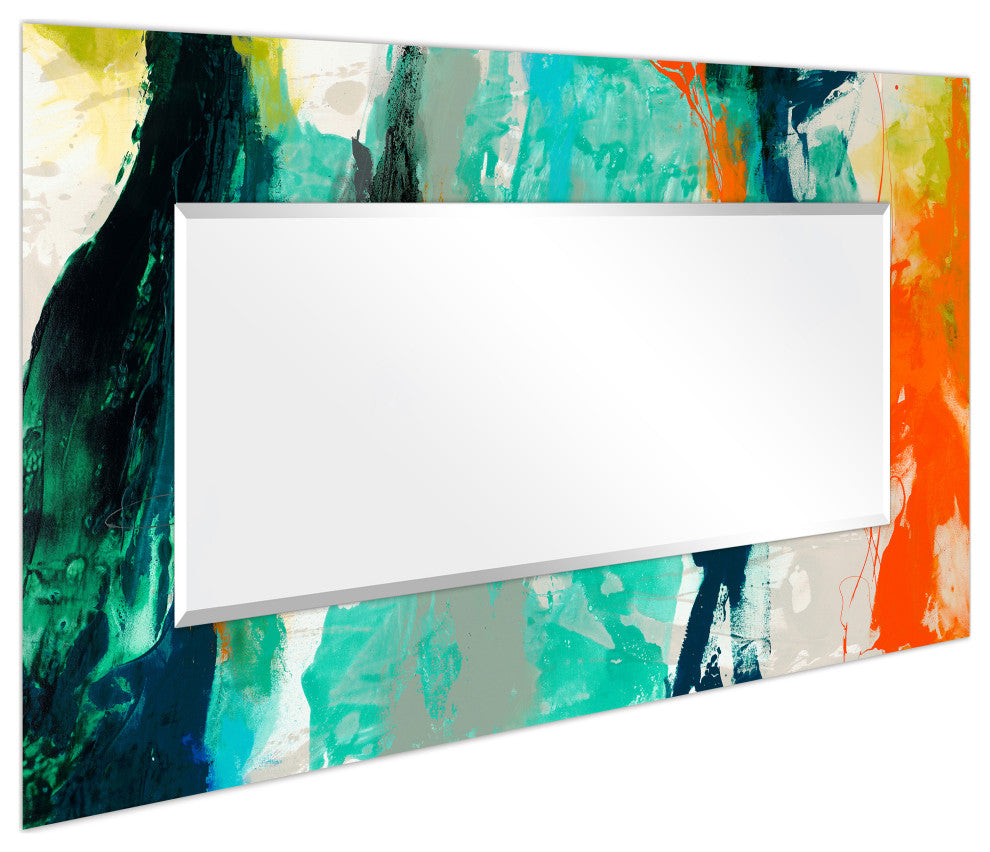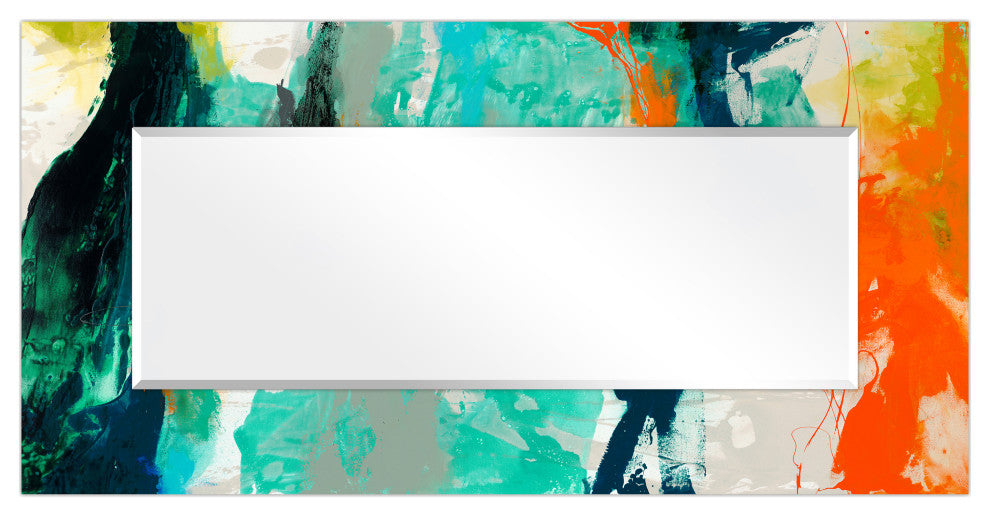 Empire Art Direct"™s collection of printed, frame-less, free floating, tempered glass was inspired by the French technique of Verre Eglomise in which artist''s literally painted the back of clear glass so that when viewed from the front the painting is brought to life under the depth of the glass. This piece of a beautiful colorful abstract takes that same tempered glass and displays a beveled mirror in front of it. 4 strong steel hangers are attached to the back of the mirror for a quick and easy vertical or horizontal installation.