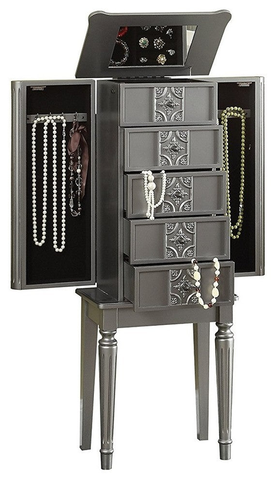 This stunning Jewelry Armoire features a stylish light blue finish, expertly crafted from quality wood and composite materials, designed to harmonize perfectly with any decor. The spacious design includes a top lid equipped with a mirror, along with ample jewelry storage protection, featuring a velvet lining and a convenient cord management precut hole. The flexible side doors open to reveal additional velvet-lined storage with hooks to keep your necklaces untangled and easily accessible. Features:• Finish: White Finish• Material: Wood, Mirror, Composite Wood• KD Leg, 4 Drawer• Top: Lid w/Mirror, Jewelry Storage & Cord mgmt: PreCut Hole (Velvet Lined)• Side Doors w/Jewelry Storage (Hooks/Velvet Lined)• Drawer: GLIDE Side Wood, Felt Lined Drawers• Wooden Fluted/Tapered Legs• Anti-Tipping Strap IncludedDimensions:• Product Dimensions: 16"L X 10"W X 40"H• Net Weight: 45 lbs• Package Dimensions: 29"L X 18.5"W X 13"H• Gross Weight: 37 lbs• Package Type: ISTA-3A• Ship Type: GROUND