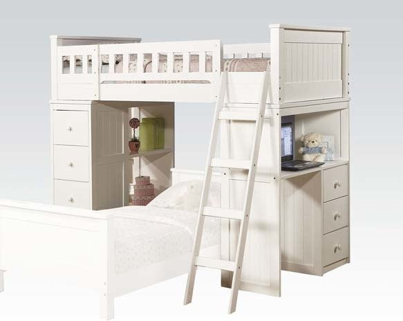 Description: Finish: White FinishMaterial: Wood, Composite Wood, VeneerWood (Solid), Veneer (LVL/PU Paper), MDF, PB, Ply Complies: ASTM F 1427-07 Bunkbed Safety StandardFeatures: KD, Twin Loft BedSlat System Included (16 Slats)Not Reversible (RF Desk, LF 5Drw Chest)RF Front Ladder (Not Reversible/Removable)Easy Access Guard-Rail (Top Bed)Twin Bottom Bed Sold SeparatelyClearance Between Floor and Top Bed: 48 Inches (1213mm) Assembly Required: Attribute: KD, Twin Loft BedSlat System Included (16 Slats)Not Reversible (RF Desk, LF 5Drw Chest)RF Front Ladder (Not Reversible/Removable)Easy Access Guard-Rail (Top Bed)Twin Bottom Bed Sold SeparatelyClearance Between Floor and Top Bed: 48 Inches (1213mm)Product Dimensions: 79"L x 42"W x 66"H