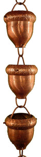 This Acorn Cups Rain Chain will complement any home design! Acorns from the mighty oak tree, formed into a functional pure copper rain chain with the top of the cup hand tooled. Connecting wires have threaded nuts at the ends; simple assembly with just a pair of pliers. Comes with a 3" copper installation kit for easy installation.Extra large acorn styled cups will handle heavy rainfall.Top of cup is hand tooled replicating the acorn stem.Made of thick, pure copper.Comes with v-hook for easy installation.A great addition and complement to copper gutters.Top wires and nuts supplied; assembly required.Cup Width: 4 1/8"Cup Height: 4"Bottom Opening: 1"