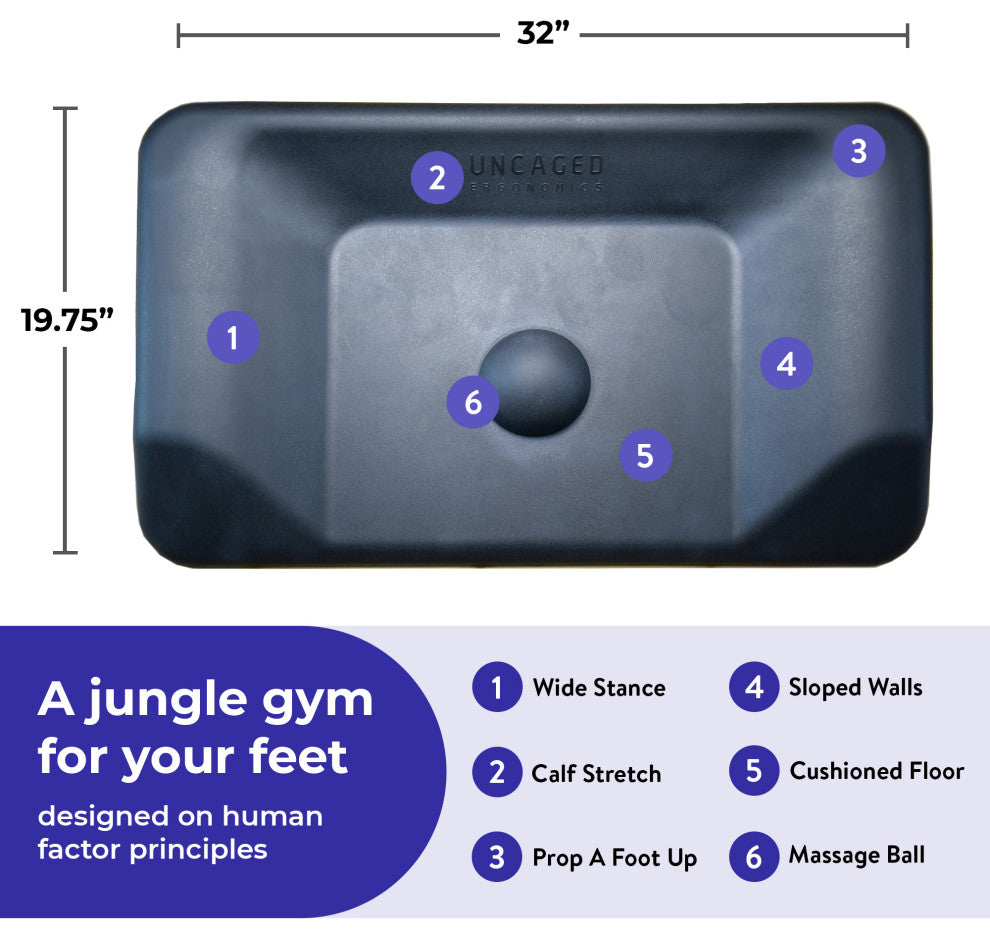 Stand comfortably for longer periods with this ergonomic, not-flat anti-fatigue mat. The contoured terrain mat is engineered based on human factor principles to let you move in natural comfort. Prop a foot up, take a wide stance, stretch your calves, massage your insoles, or stand still in cushioned comfort with this anti-fatigue floor mat. It"™s like a jungle gym for your feet!The patented Active Standing Mat has a contoured surface that"™s specifically engineered to encourage movement while standing. A 1"� thick floor provides excellent cushioning comfort that you can feel when standing still. Sloped sidewalls allow you to elevate one or both feet, stretch your calves and stand comfortably with a wider stance. The center massage ball lights up those neurons as it soothes and stretches your feet.LARGE NOT-FLAT ANTI-FATIGUE MAT:The Active Standing Anti-Fatigue Mat is manufactured with a premium, high-density molded foam. It"™s a solid, 1-piece design without pleather or other cheap materials to hide defects. Our industrial design engineers calculated the correct density and materials to provide cushioned, anti-fatigue properties that you can feel as soon as you step on the mat. Size, dimensions, and properties of the mat are based on human factor principles: it"™s small and light enough to be easily moved but large enough to give you room to move. The Active Standing mat fits perfectly in most cubes and offices and it"™s one of the best standing desk mats for active standing!DIMENSIONS:Weight: only 8 lbsSize: 32x19.75x3.5 inchThickness: 1 inch thick floorMaterial: polyurethaneAll measurements are approximate.