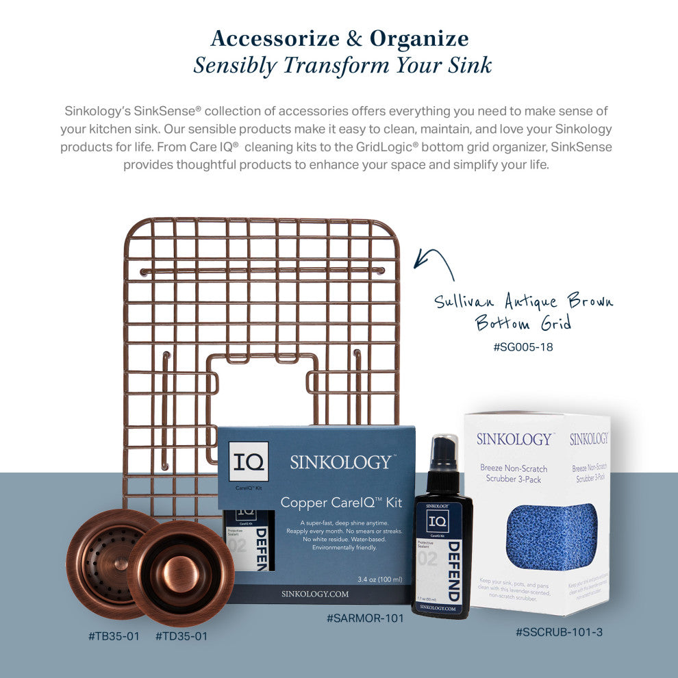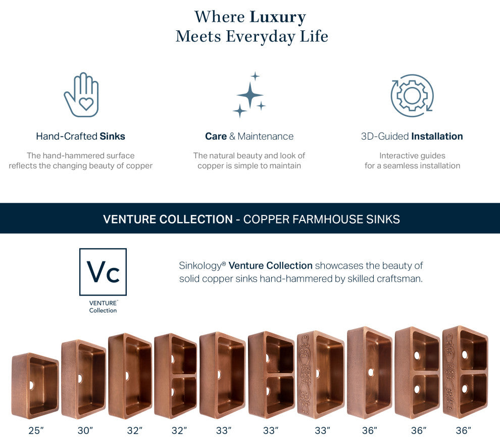 Sometimes "classic" is "classic" for a reason. The beautiful, copper apron front of the Adams farmhouse kitchen sink is both classic and striking, while immediately elevating any space. The double bowl design allows space for washing and drying at the same time. Our durable, solid copper sinks are hand-hammered by skilled craftsman and protected by our lifetime warranty.Dimensions: 33" x 22" x 9"Bold farmhouse apron creates an alluring and central focal point Double bowl helps separate the clean dishes from the dirtyHand-hammered, solid 16-gauge copper is protected by our lifetime warrantySound dampening pads reduce dish clatter, noise, and vibrationsAntique Copper is aged to a medium-to-light tone for that classic copper lookRecommended Products: Sullivan Kitchen Sink Bottom Grid in Antique Brown (#SG005-18)Kitchen Sink Basket Strainer Drain in Antique Copper (#TB35-01)Kitchen Sink Disposal Drain Flange in Antique Copper (#TD35-01)Copper Care IQ Kit (#SARMOR-101)