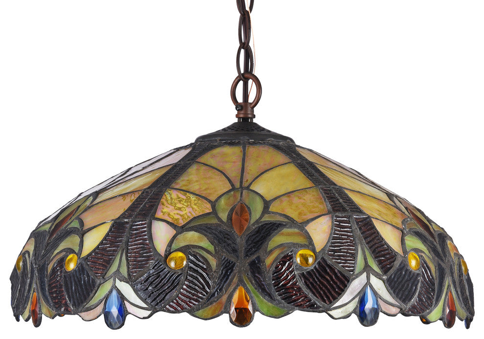 ADIA, a Tiffany-style 2 light ceiling pendant is a beautiful piece to add to your home, sure to complement other decors thoughout your home. Hand crafted from over 260 pieces of art glass, 12 beads and 18 crystals that will add color and beauty to any space. Main colors are red, orange and blue. Handcrafted using the same techniques that were developed by Louis Comfort Tiffany in the early 1900s, this beautiful Tiffany-style piece contains hand-cut pieces of stained glass, each wrapped in fine copper foil.