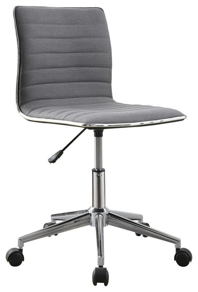 Take an office space to a casual, contemporary height. This office chair embraces a minimalist look with superb seating comfort. This sleek and modern chair is finished in chrome and upholstered in grey fabric. This chair''s modern look comes from its padded, paneled backing and armless style. Adjust the chair''s height with its single lever and enjoy easy mobility with its five casters.