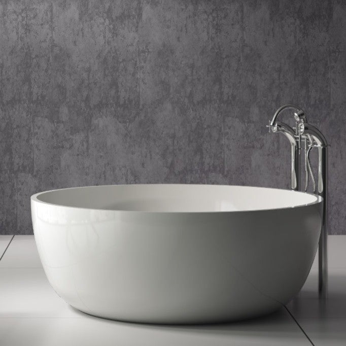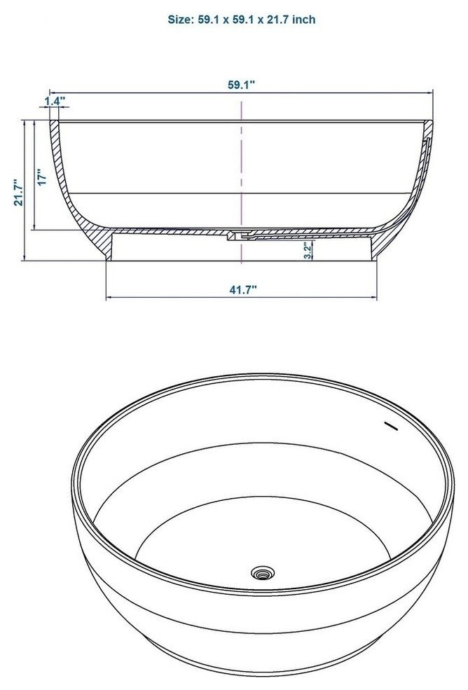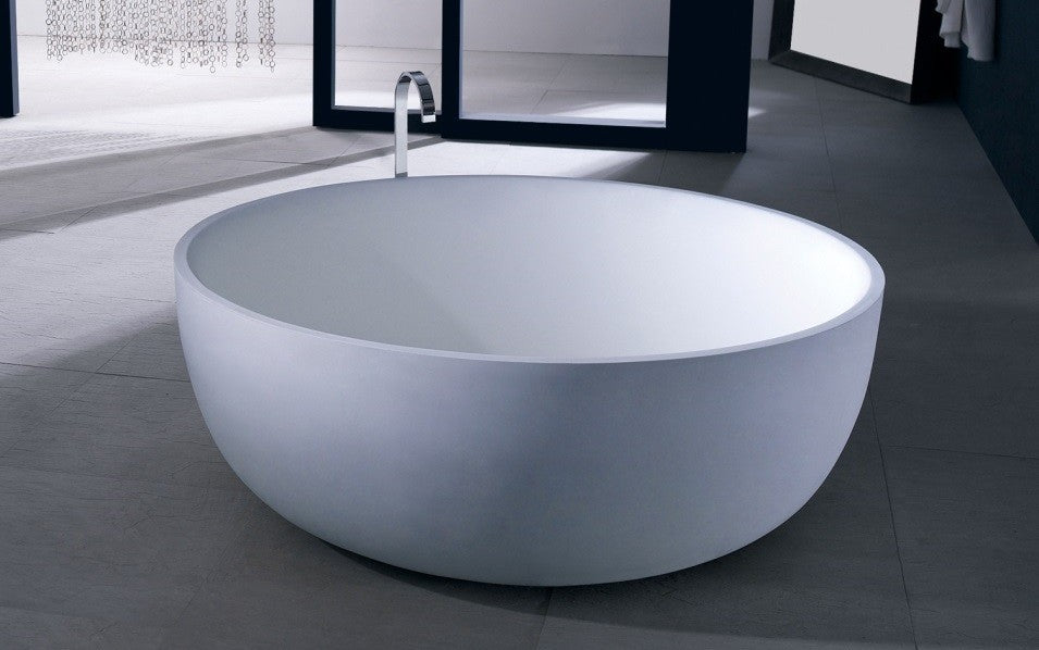 The SW-141L is the larger sized round freestanding bathtub in its series with a modern circular and curved design. All of our bathtubs are made of a durable solid white stone resin composite and available in either a matte or glossy finish. This tub combines elegance, durability, and convenience with its high quality construction and chic modern design. This symmetrical, round, and curved designed freestanding tub will surely be the center of attention and will add a modern and contemporary feel to your new bathroom. Its height from drain to overflow will give plenty of space for any individual to enjoy a soothing and comfortable relaxing bathtub experience. The SW-141L has a smooth and rounded inner rim. This bathtub can fit two people comfortably.