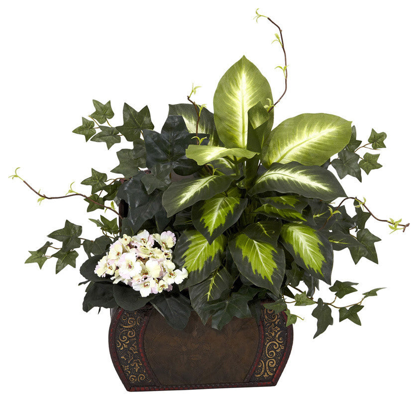 African Violet, Dieffenbachia and Ivy With Chest Silk Plant