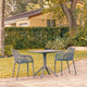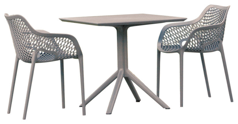Outdoor dining set with two armchairs and one square table. Made for commercial durability. Chairs are stackable. UV treated. Withstands outdoor temperatures summer and winter. Elegant and modern table has nonskid pads. Dining set is perfect for heavy use areas. Set items are 100% resistant to outdoors. Resin is virtually maintenance free. Table requires easy assembly.
