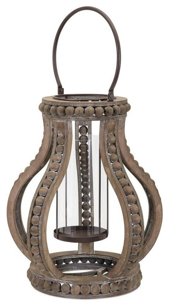 Light up your home with this antique-inspired large wood and metal lantern with oversized bead detail and handle in a distressed finish. Holds pillar candles.Item Dimensions:22"h x 13"d