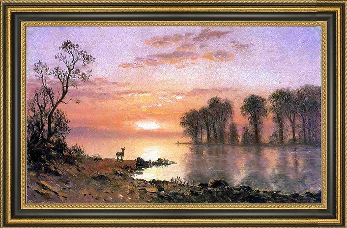 16" x 24" Albert Bierstadt Sunset framed premium canvas print reproduced to meet museum quality standards. Our Museum quality canvas prints are produced using high-precision print technology for a more accurate reproduction printed on high quality canvas with fade-resistant, archival inks. Our progressive business model allows us to offer works of art to you at the best wholesale pricing, significantly less than art gallery prices, affordable to all. This artwork is hand stretched onto wooden stretcher bars, then mounted into our 3 3/4" wide gold finish frame with black panel by one of our expert framers. Our framed canvas print comes with hardware, ready to hang on your wall. We present a comprehensive collection of exceptional canvas art reproductions by Albert Bierstadt.