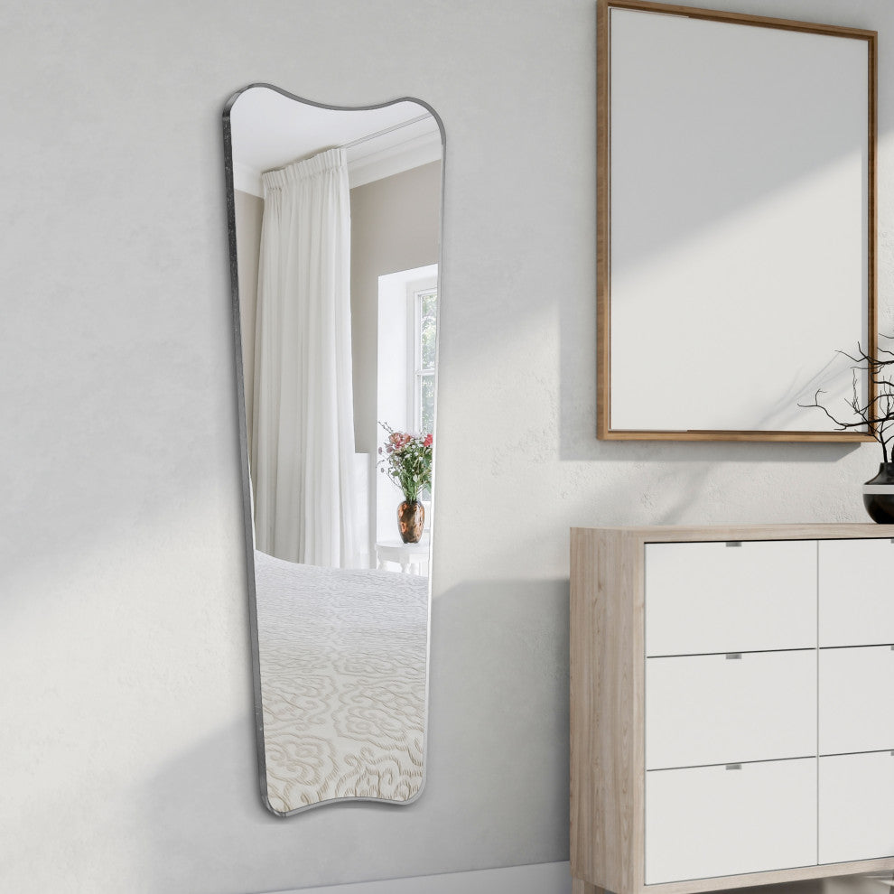 The classic curves of this modern dressing mirror add an Art Deco vibe to any space. This versatile wall-hung or wall-leaning design is strengthened by a narrow metal frame. Its vertical orientation is ideal for a closet, bedroom or entry area.