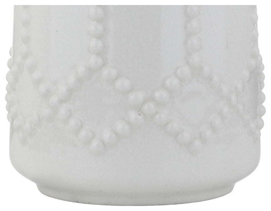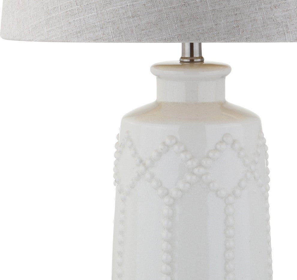 Cream-glazed ceramic shines under the natural gray cotton shade in this transitional table lamp. Well-suited for nightstands or living spaces, at 26" high it is a generous dimension for adding light and style to any space. We love the textured baubles in a geometric trellis pattern on the base, adding a boho vibe to an otherwise classic style. Features:A warm natural shade and bauble texture add cozy comfort to this ceramic table lamp 100% cotton hardback drum shadeBeautiful to display or easy to conceal: the 60" cord is silk-wrappedOn-off rotary switch on socketEco-friendly 9W LED bulb includedTakes one bulb and compatible with any 12W LED or 100W Type "A" or 23W CFLUL ListedColor: Cream with white shadeBody Material: CeramicBase Material: CeramicFinial Material: ResinFinial Color: CreamHarp Color: SilverIncludes: One (1) lamp(s)Minor Assembly RequiredDimensions:Lamp: 26 inches high x 16 inches wide x 16 inches deepShade: 10.5 inches high x 16 inches wide x 16 inches deepAbout us:You see a lamp.We see a decorative work of art.A perfectly curved shade casts a dramatic shadow on a floor. A silk cord you never want to hide. LED lightbulbs: as easy on the environment as they are on the eyes. The JONATHAN Y Lighting collection considers every detail from impeccably sourced materials to designer styling. And our prices are so attractive, we''ve transformed a functional necessity into a fashion accessory.JONATHAN Y Lighting - a fashion revolution in home decor.