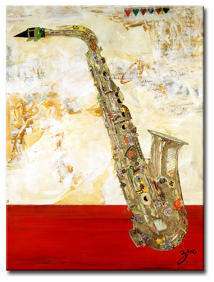 Salvatore Principe abstract ''All Dat Clean'' adds "sax" appeal to any room; the familiar smooth sound of the jazz instrument plays in your mind as you luxuriate in this exquisite art piece. This stunning canvas creates a romantic ambiance with a zealous red block contrasting below the gold background. Peering through the opaque dusting of rustic color, an illegible sheet of music fades away nostalgically. Generate a lively, and inspired atmosphere when you add this classy canvas to your home. Handcrafted in the United States, this gallery-wrapped canvas art arrives ready to hang on your wall.