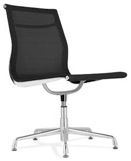 Aluminum Mesh Side Chair is a classic of functional chic, favored for over half a century. This popular chair comprises elegance and style in a structure designed for comfort. Its unique design follows the contours of the back and provides the best support for your spine. The elegant profile and timeless look of the chair are there to last. Aluminum Mesh Side Chair features lightweight aluminum frame with breathable mesh upholstery, 5-star base with glides and a swivel mechanism. Features: - Aluminum frame and base - Tubular steel column - 5-star base and 360-degree swivel - Innovative mesh material that allows the chair to breathe - Available in White or Black mesh - Suitable for residential or commercial use - 21"W x 20"D x 17"Seat Height