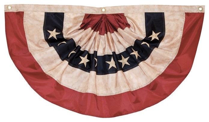 An attractive and enduring way to show your patriotic spirit! This Americana Bunting features high-quality embroidered stars on a heavy-duty "tea-stained" red, white and blue fabric. A beautifully pleated half circle attached to a heavy duty fabric header with brass grommets - you''ll want this on display all year! • Weather and fade resistant 420 denier polyester fabric • Heavy polyester fabric heading and brass grommets • Applique design with quality embroidered stars • No assembly required