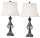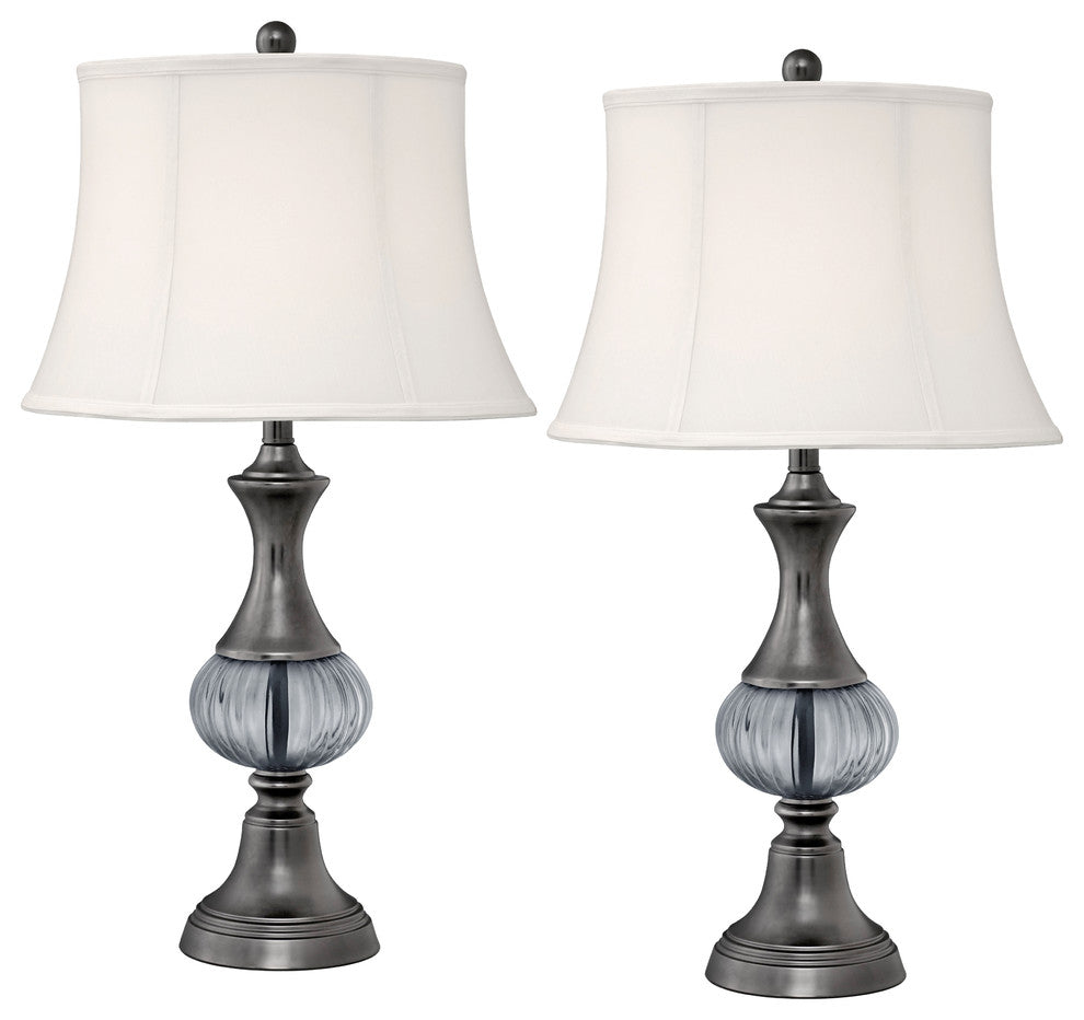 Standard Lamp Specifications for #GM843:Product Type: Table LampHeight: 30Finish: Gunmetal with SmokeConstruction: Steel/GlassSocket: (1) Aluminum 3-way E26 Med. Base Type A 150W Max socket(s) - Bulb(s) not incSwitching: (1) 3-way turn knob switch(es) located on the socket.Cord: 6.5" long (from base) brown SPT-2 cord set with a 2 prong polarized plug.UL/CUL and/or ETL listed: YesHarp Size: 9.5 inches (including the saddle)