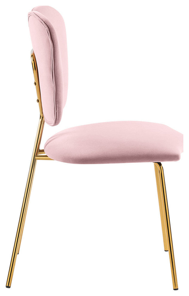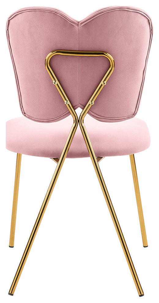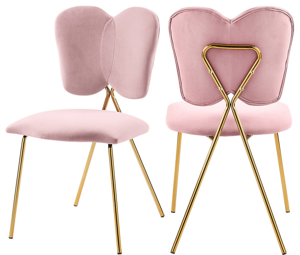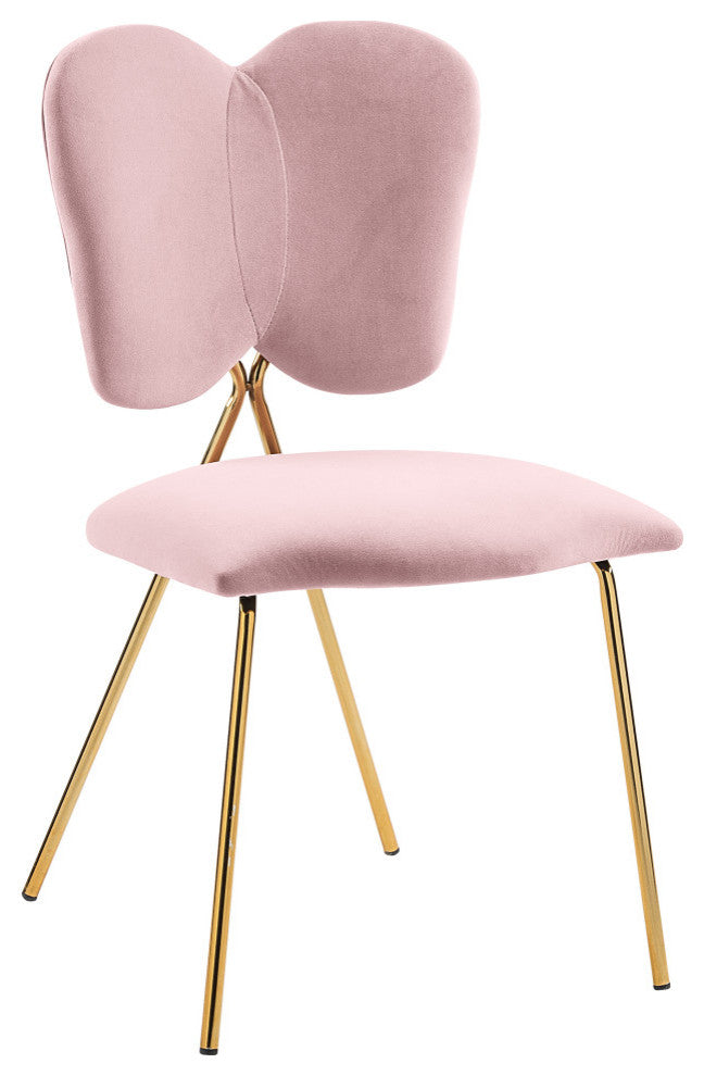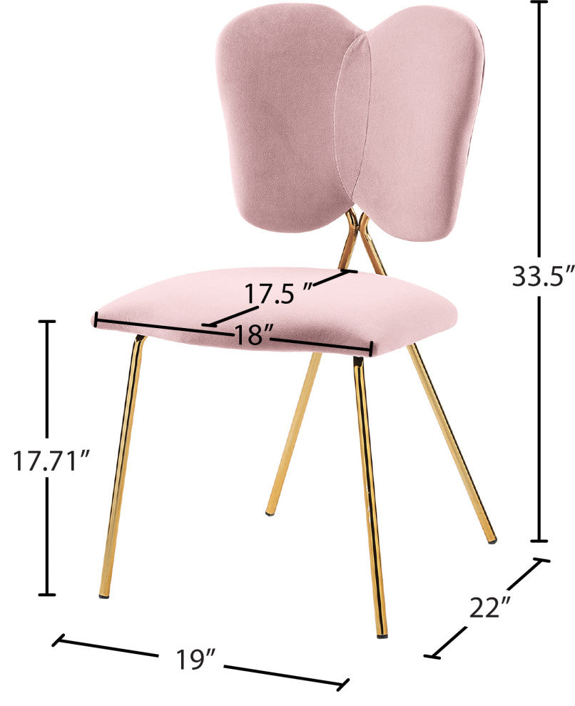 Bring a heavenly look to your dining room with this Angel velvet dining chair that''s upholstered in rich pink velvet material. The butterfly shaped back of the chair is heavily padded, as is the seat, ensuring that guests stay seated comfortably from the salad course through dessert. Ideal for casual dining, this uber attractive chair rests on a metal frame finished in gold for a modern boost in your dining space.Overall Product Dimensions: 19" W x 22" D x 33.5" HSoft Pink VelvetButterfly Shaped BackGold Iron LegsContemporary DesignSeat Dimensions: Seat Width: 18"Seat Height: 17.71"Seat Depth: 17.5"Back Height: 15.79"