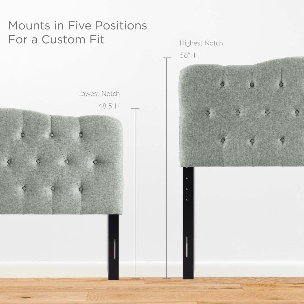 Annabel Queen Upholstered Fabric Headboard - GrayInstill soft tones and a meaningful design with the Annabel tufted arch headboard. Deep inset buttons adorn this magnificent centerpiece for your bedroom dcor. Annabel is made from fiberboard, plywood, and fine polyester upholstery for a construction that is both lightweight and long-lasting. Carefully crafted with flowing contours and a richly rewarding design, sleep peacefully while supported by this exceptional headboard. Fits queen size beds.Set Includes:One - Annabel Queen HeadboardElegantly tufted button headboardFits queen size bedsDeep inset buttonsFine polyester upholsteringFiberboard and plywood frameOverall Product Dimensions: 4"L x 62"W x 48.5 - 56"HBedframe Mounting Location: 4.5 - 8.5"HMounting Location A - Height to Top of Headboard: 56"HMounting Location A - Height to Bottom of Headboard: 30.5"HMounting Location B - Height to Top of Headboard: 53.5"HMounting Location B - Height to Bottom of Headboard: 28"HMounting Location C - Height to Top of Headboard: 51"HMounting Location C - Height to Bottom of Headboard: 25.5"HMounting Location D - Height to Top of Headboard: 48.5"HMounting Location D - Height to Bottom of Headboard: 23"HFloor to Top of Headboard: 48.5 - 56"HFloor to Bottom of the Headboard: 23 - 30.5"HProduct Materials: Frame: MDF, LVL, Plywood, Fabric Material: 100% Polyester