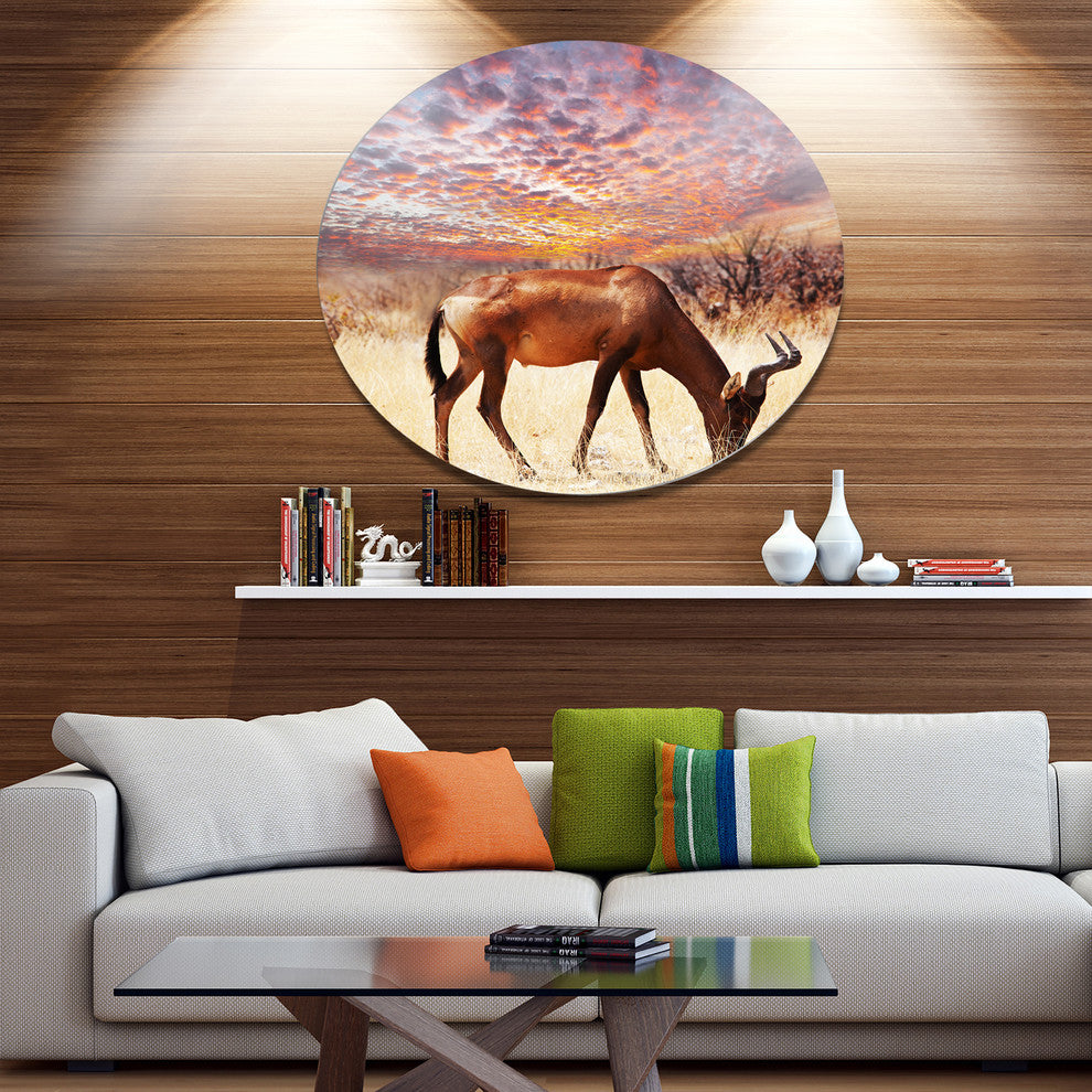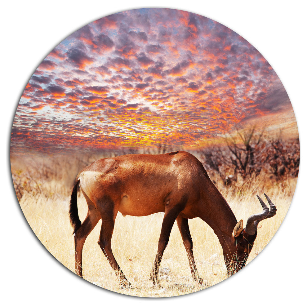 Bring Contemporary Abstraction to your home with this large Circle Metal wall art. This Antelope in Bush under Dramatic Sky Metal Artwork makes it the focal point of any room or office.