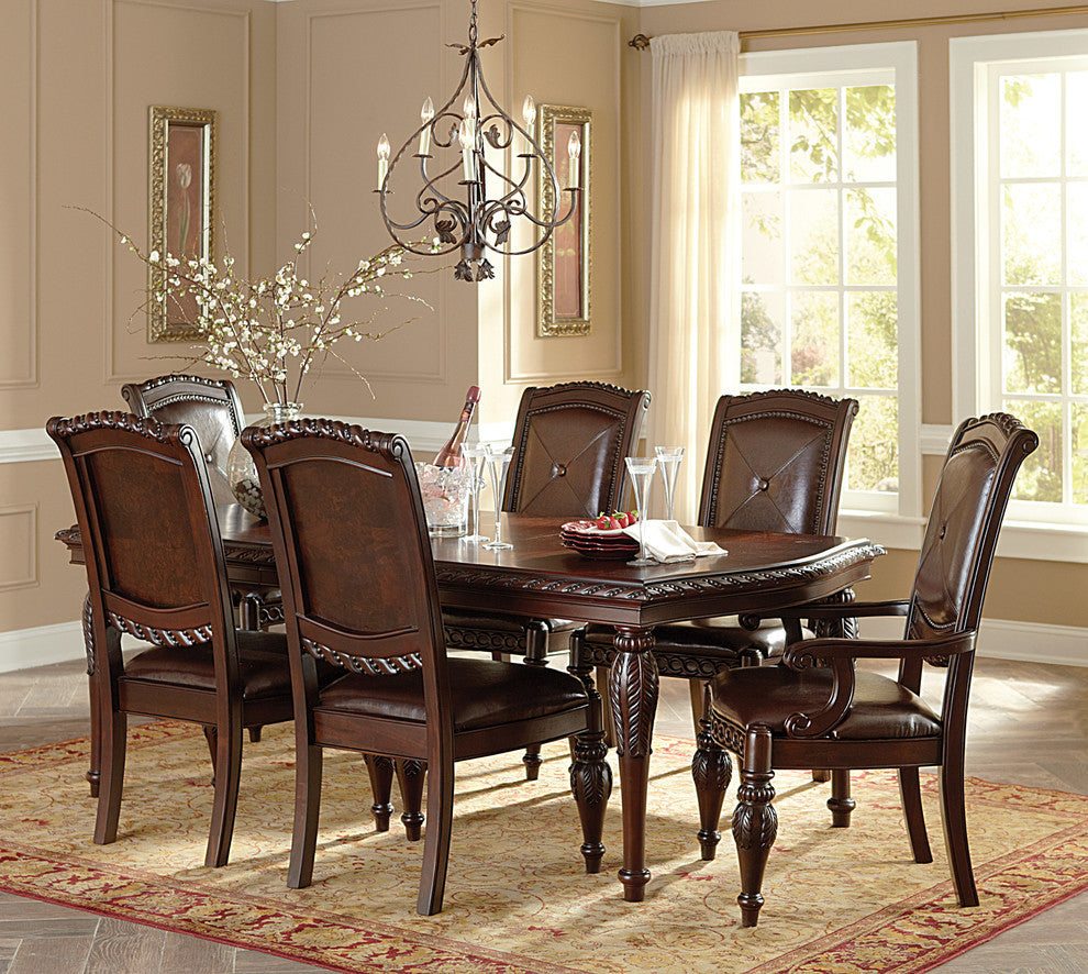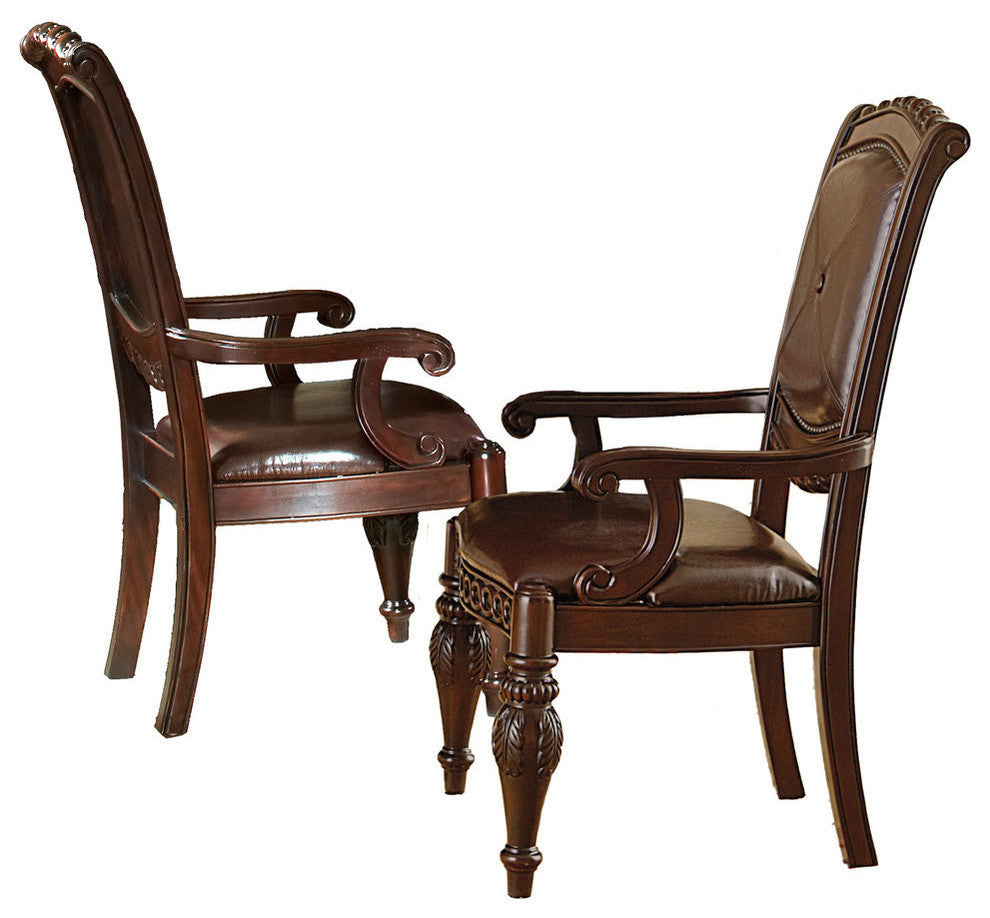 Antoinette Arm Chair, 26"x27"x44"The Antoinette Dining Collection, with its exquisitely-carved details and lush finish, makes any dining room fit for a queen. With multiple design elements and carving details, this collection is made with sturdy mahogany solids and cherry veneers in a multi-step warm brown cherry finish. The dining table with 24" leaf seats up to ten comfortably, with matching side chairs and arm chairs featuring split leather seats and backs. The matching buffet offers plenty of storage and serving space, and pairs with the elegant display hutch to complete the look.The Antoinette Arm Chairs feature detailed hand carvings, split leather upholstery, and cherry and mahogany burl inlays in the chair backs giving it the look and feel of an antique.Multi-Step hand applied glazed finish in a warm brown cherryTraditional StyleCorner Block Construction on Chairs and TableSolid WoodSplit leather seats and backs18" Seat Height