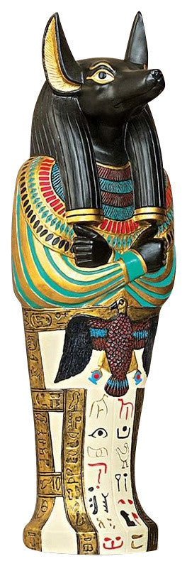 Adorn your walls with the treasure of Egyptian kings! The sarcophagus of Anubis the jackal god is a quality designer resin collectible painstakingly hand-painted in the bright tones and faux gold accents of the Egyptian palette. 4"Wx2"Dx12"H. 2 lbs.