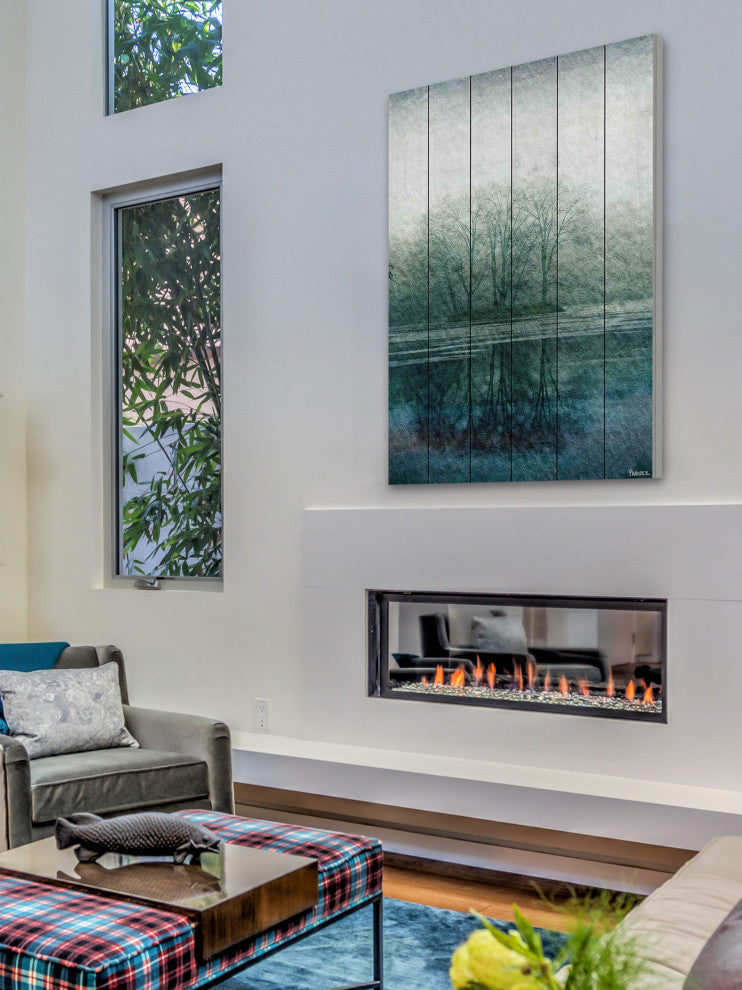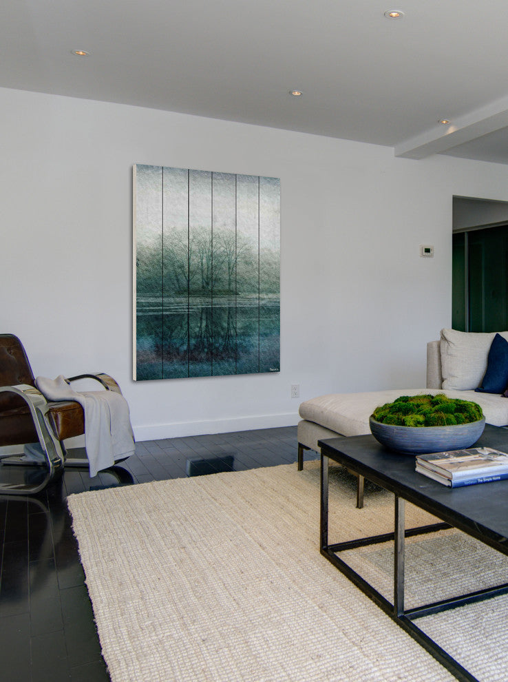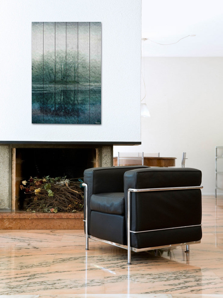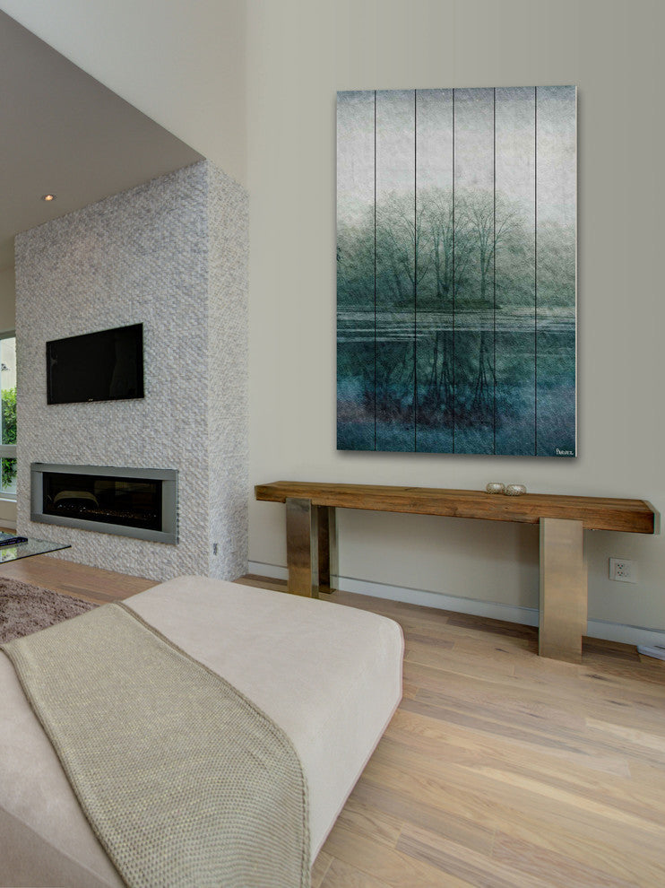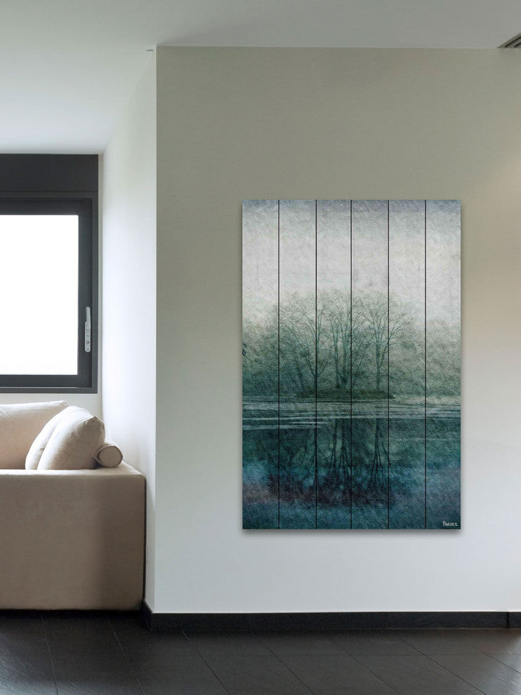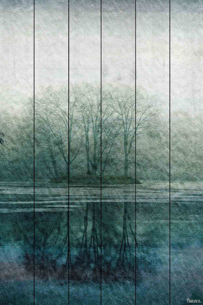 Striking and unique, the "Apple Lake" UV Ink Print on White Wood by Parvez Taj will bring your walls to life. Printed on white pine wood, this 30 inch wide by 45 inch tall contemporary artwork will make a statement in any living room, dining room, or bedroom.- Fine art UV ink print on white wood by Parvez Taj- wood pieces are hand-selected by Fine craftsmen for printing- Arrives ready to hang- Includes a certificate of authenticity- Artist signature on the front