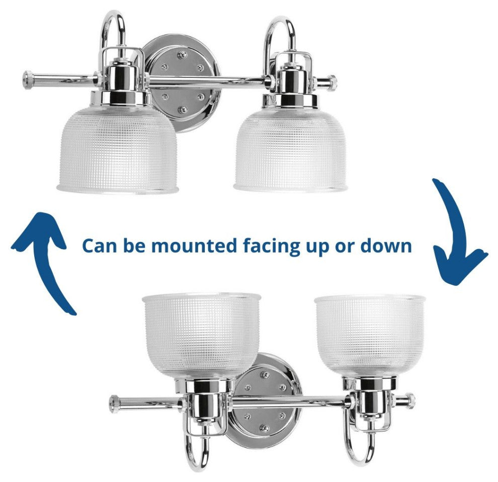 Archie is a standout in any room and provides a fun and fashionable way to light your home. The authentic, prismatic style glass shade diffuses light to provide functional and stylish illumination. Finely crafted strap and knob details are conveyed by the Polished Chrome finish. This two-light fixture can be installed with the glass facing up or down to suit your preference.Finish: Polished ChromeBulb Type: Uses Medium BaseBulb Wattage: 100Bulb Quantity: 2Listed: Damp location listedMount Type: WallStyle: Traditional/ClassicFeatures: Chrome finishFancy clear prismatic glass gives stylish touchDouble glass shade diffuses light to provide functional illuminationFinely crafted strap and knob detailsRoom Type: Bathroom Lighting and/or Hall & Foyer LightingDimensions: Width/Diameter:17"Height:8-3/4"Specifications:Mounting:Wall mountedMounting strap for outlet box includedMounts in up or down positionBack plate covers a standard 4 hexagonal recessed outlet box 5-1/8 dia.Electrical:Pre-wired6 of wire supplied120VLamping:Quantity: 2100W Medium BaseMedium ceramic socketsAdditional Information:UL-CUL Damp location listed1 year warrantyCompanion Bath and Vanity, Chandelier, Close-to-ceiling, Pendant, fixtures are available