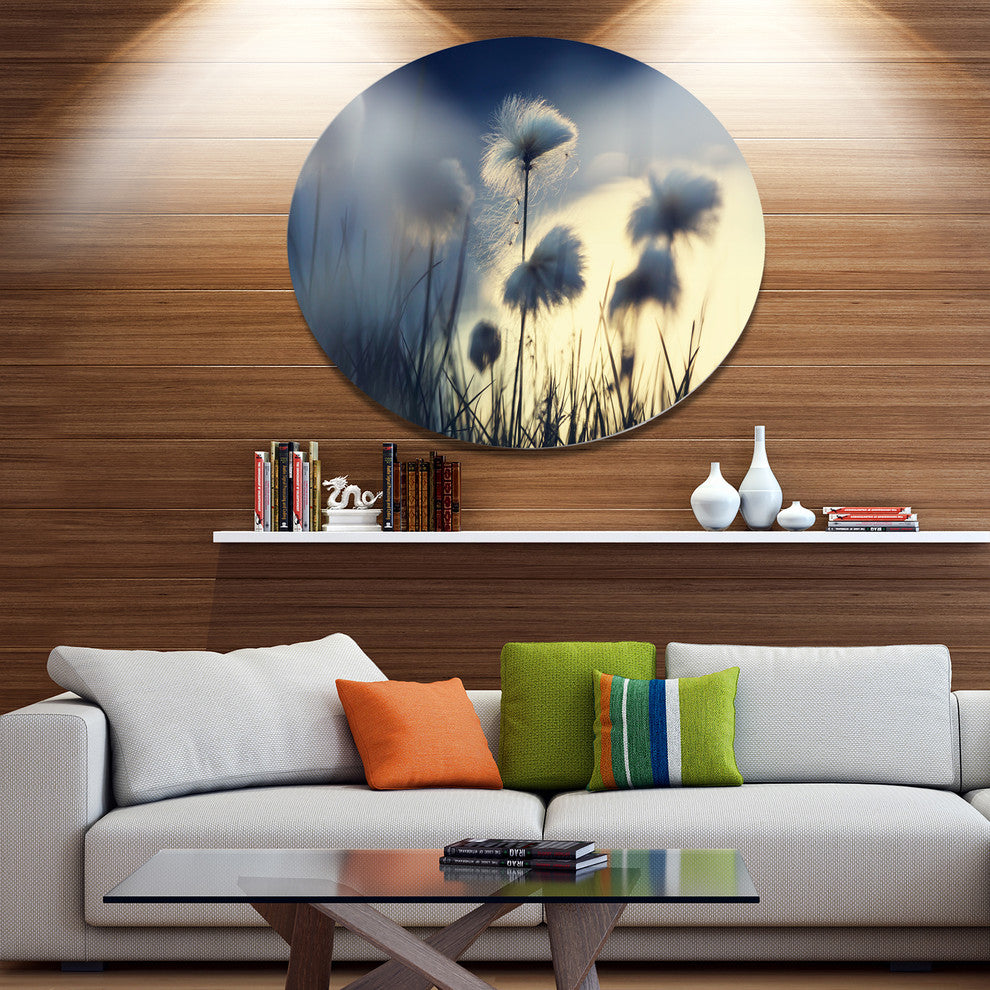 Bring Contemporary Abstraction to your home with this large Circle Metal wall art. This Arctic Blooming Cotton Flowers Metal Artwork makes it the focal point of any room or office.