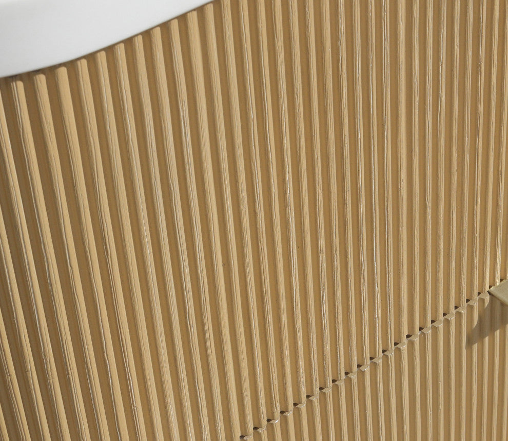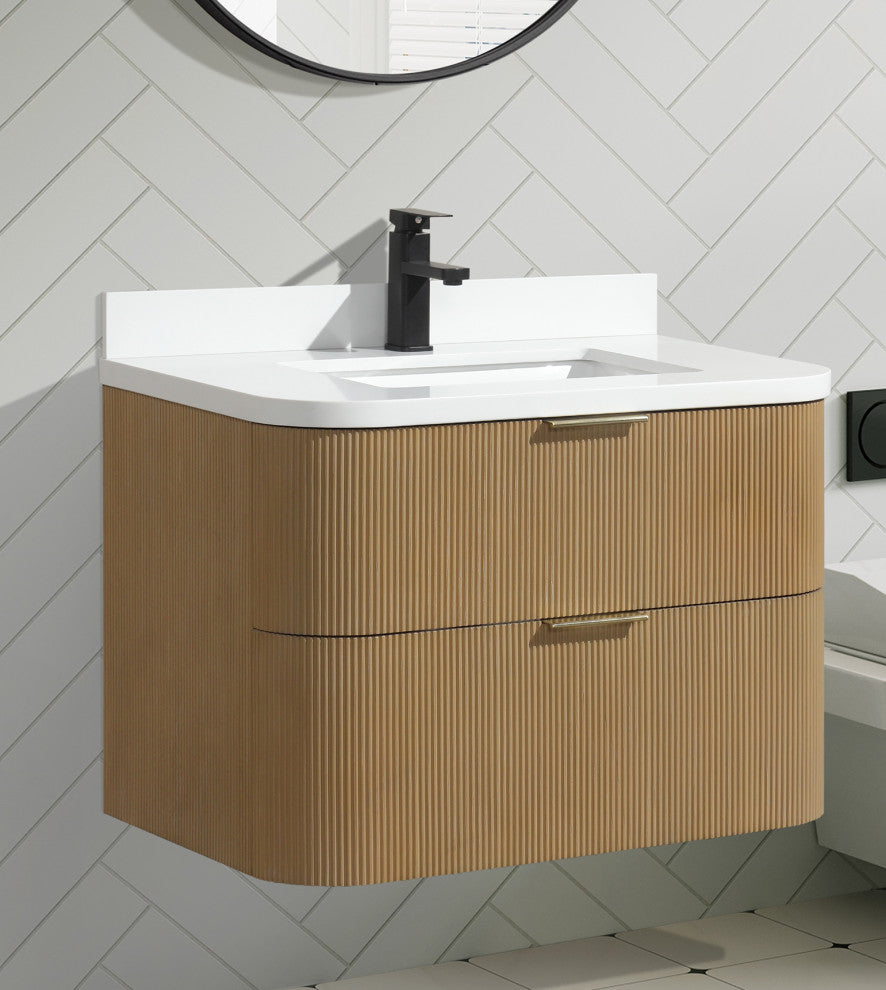 Elevate your bathroom with the 30-inch Chantal bathroom vanity, designed to be the centerpiece of your remodel. Expertly constructed from solid wood, this vanity is built to last for years. Its raised grain finish adds a distressed, reclaimed charm to the piece. Two spacious, solid wood dovetail drawers with full-extension glides offer plenty of room for your everyday essentials. The fluted drawer fronts enhance the texture and beautifully highlight the natural wood grain, making this vanity both functional and stylishSolid wood construction/frameThe vanity is handcrafted and stained by skilled artisans, resulting in a unique finish for each piece.The solid wood dovetail drawer boxes add to the durability and quality of the vanity.The drawers feature soft closing mechanisms and full extension glides for a smooth and quiet closing.The wood is finished to prevent warping, cracking, and to withstand the high humidity levels of bathrooms.Engineered white quartz countertopBeautiful gold pullsThe vanity is finished in oak, reclaimed, and rustic wood appearance, adding to the overall aesthetic of the piece.Dimensions: 30" W x 21.65" H x 21" D