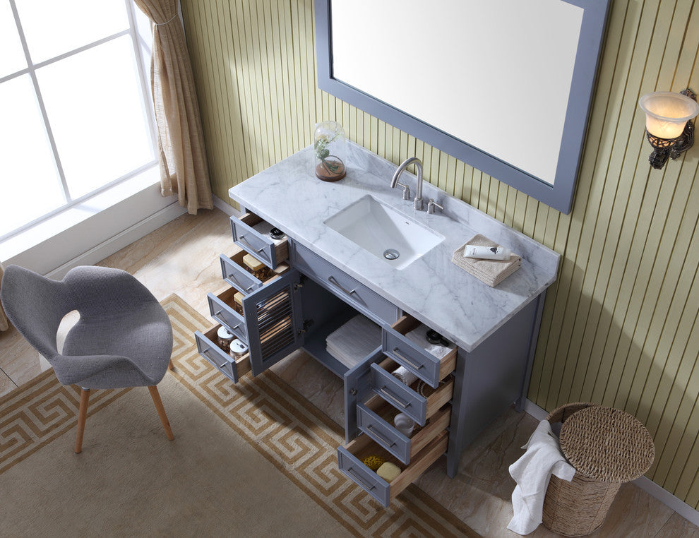 Ariel Kensington 55 Inches Gray Single Sink Vanity SetAdd a touch of elegance to your traditional bathroom with a beautiful Kensington bathroom vanity from ARIEL. The Kensington series features solid wood cabinets with matching framed mirrors and white carrara marble countertops. These vanities will be sure to add style and storage to your bathroom decor. Vanity Features:Vanity Size: 55"W x 22"D x 35"HSolid wood frame with plywood panels for lasting beauty and durabilityGray painted finishTwo soft-closing doors with adjustable hinges so you''ll never have to worry about hearing a door slamDovetail construction drawer boxes for additional strength and durabilityEight full extension, self-closing drawers to meet all your storage needsLouvre style doors to create a transitional cottage aestheticAngled legs create the feeling of a furniture showpiece for your bathroomSatin nickel finish hardware includedOpen back for easier installationCarrara White marble countertop with 1.5 in. edge and matching backsplashCountertop pre-drilled for 8 in. widespread faucetsIncluded: fully assembled base cabinet, countertop with matching backsplash, matching framed mirror, sink(s)Some assembly required - sink(s) to countertop and countertop to cabinet - see installation guideOrder your 55"� Traditional Single Sink Bathroom Vanity Today and enjoy FREE Shipping with no tax or fees! Buy Now!Ariel Vanity Specifications:Base cabinet, Hardware, Countertop, Backsplash, Sink(s)3 Year Limited PartsCabinet Material: Solid wood & plywoodWood Species: Oak & Birch55"W x 22"D x 35"HVanity Color: GrayHandles/Knobs Finish: Satin NickelCountertop Size: 22"L x 49"W x 1.5"HMirror Dimensions: 54"W x 35"HSink Dimensions: 20.5"L x 15"W x 7.5"H
