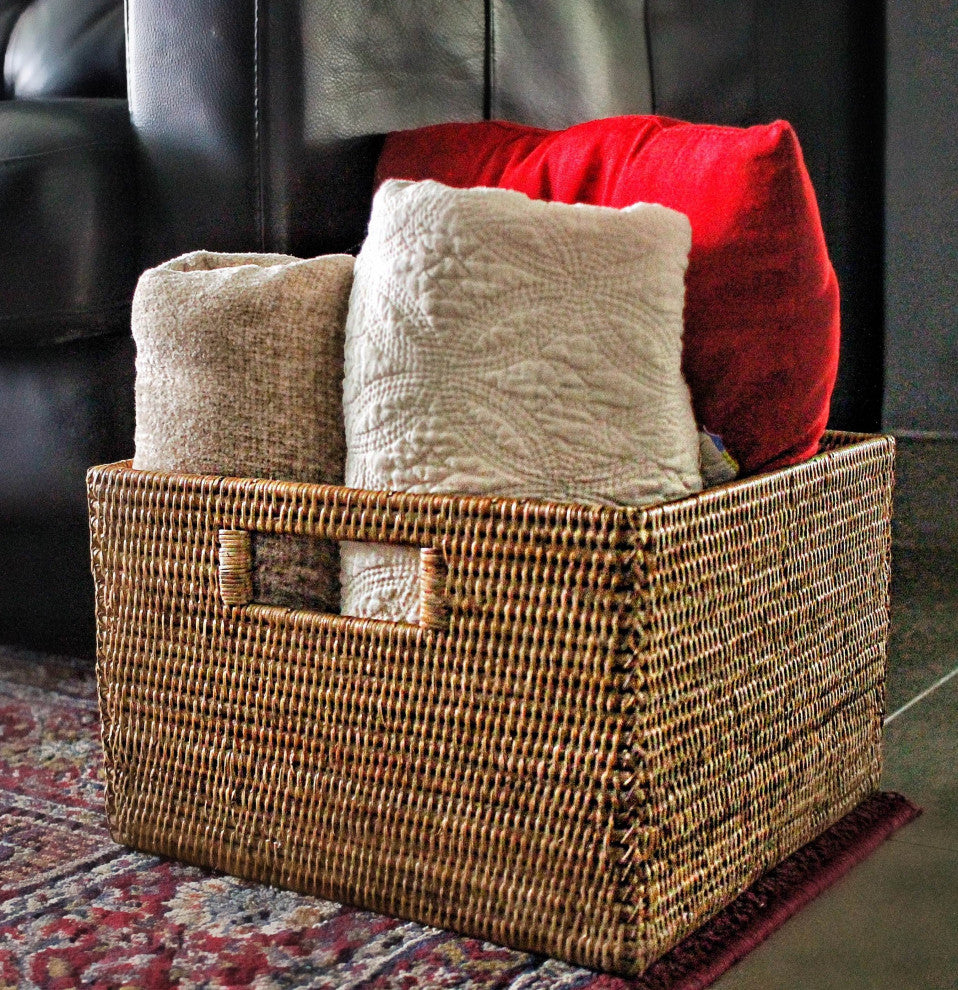 A good storage basket is not only functional but must fit into your home decor as well. Our rattan storage box will add organization and style to any room and will also add beauty and elegance to your life.This basket will help you add that extra bit of storage that can make a real difference and keep your space tidy.Woven from Burmese rattan which is natural and sustainable, our products come stained in Honey-Brown, Tudor Black, or White Wash. Products are handmade and each piece is unique therefore slight variations and imperfections exist.-Dimensions (inches): 13.5"x11.5"x10.5"-Hand Woven by Local Artisans from Burmese Rattan-Natural and Sustainable Product-Wipe Clean with Damp Cloth-Made in Myanmar