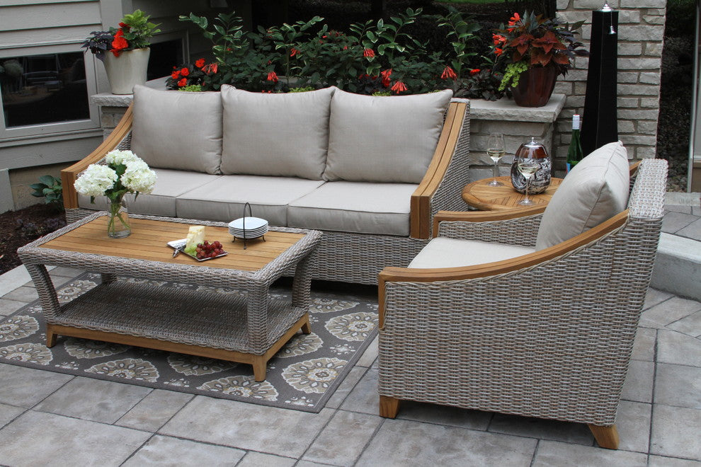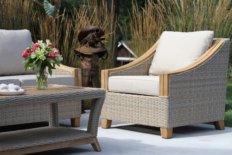 Easy to clean, weatherproof, and eco-friendly, teak is a perfect material for outdoor spaces. This armchair "“ meant to live alfresco "“ takes advantage of this must-have wood"™s natural grain pattern and moisture-resistant properties, pairing it with resin wicker to create a stylish, low-maintenance place to perch as you sip homemade sangria. Two cushions upholstered in Sunbrella fabric augment the breezy look of this piece while bolstering its weather resistance.What''s Included? 1 armchair 2 seat and back cushionsFeatures Protective resin footpads Stainless steel hardware Fully assembled Matching sofa and coffee table sold separately Product Details Materials: sustainable 100% FSC teak, HDPE all-weather wicker, powder-coated aluminum frames, and Sunbrella fabrics Dimensions: 36" W x 32" D x 32" H Seat height: 19" Color: Natural teak and ash grey wickerProduct Care If the table becomes soiled, use a mild detergent and a soft cloth only. Do not use abrasive cleaners or cleaning products. To maintain the natural finish of your teak furniture, we recommend teak oil or refined/boiled linseed oil to be used in the spring and summer. Always cover or store away your furniture during harsh weather and winter.CAUTION: Oil-soaked rags should be disposed of carefully.