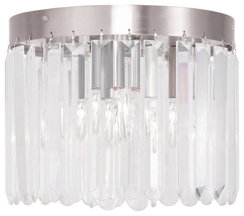 The Ashton three light flush mount emanates the 1920s casual style mixed beautifully with high sophistication. classical touches in the flush mount gives off an art deco feel with the prismatic crystals.