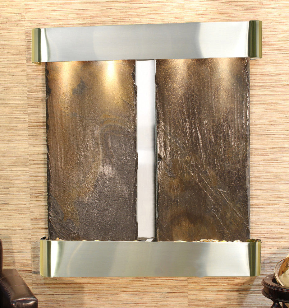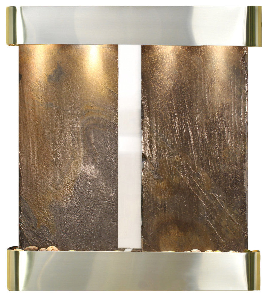 The Aspen Falls water fountain features two panels of natural slate, marble, mirror, or FeatherStone. The beauty of flowing water is doubled with the two water surfaces. Many metal trim options are also available to help you enjoy the sound of running water. An EZ install bracket is included, making hanging the water feature simple. The water feature only needs to be cleaned every 2-3 months if you are using distilled water. 50" L x 54" H x 6" D, easy to hang, complete with colored instructions and hardware for hanging on a sheetrock wall. Hanging Weight 315 lbs.This unit includes: 4 halogen lights Polished river rocks Electric pump 3-way pull chain that allows you to run just lights, just water, or lights and water. Welded plastic liner insures against leaking and unique water distribution unit system will not clog. 110V, 100W; one cord operates entire unit; 90 degree plug can be concealed behind water feature. Durable powder coat finish; Manufactured and assembled in the USA with a 1 year limited warranty. • All slates are natural and may differ in color and texture from the picture shown due to their natural uniqueness.