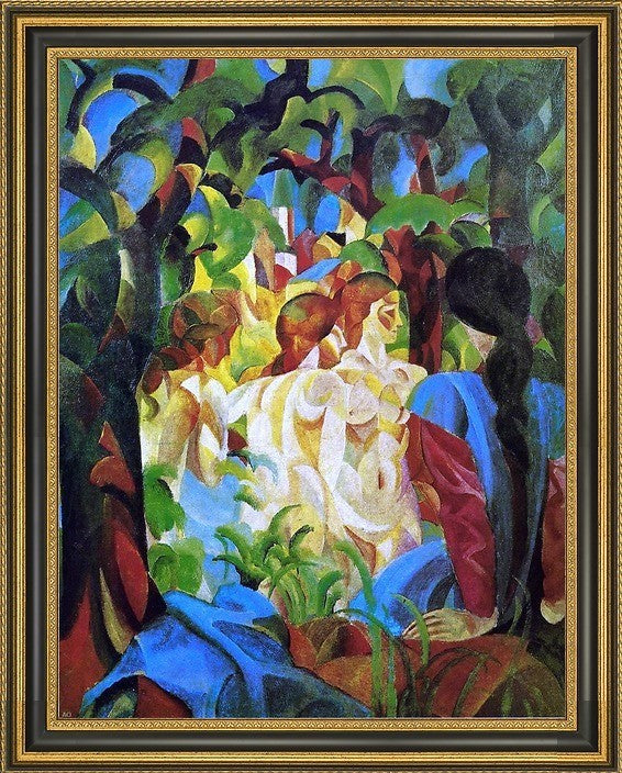 18" x 24" August Macke Girls Bathing with Town in Background framed premium canvas print reproduced to meet museum quality standards. Our Museum quality canvas prints are produced using high-precision print technology for a more accurate reproduction printed on high quality canvas with fade-resistant, archival inks. Our progressive business model allows us to offer works of art to you at the best wholesale pricing, significantly less than art gallery prices, affordable to all. This artwork is hand stretched onto wooden stretcher bars, then mounted into our 3 3/4" wide gold finish frame with black panel by one of our expert framers. Our framed canvas print comes with hardware, ready to hang on your wall. We present a comprehensive collection of exceptional canvas art reproductions by August Macke .