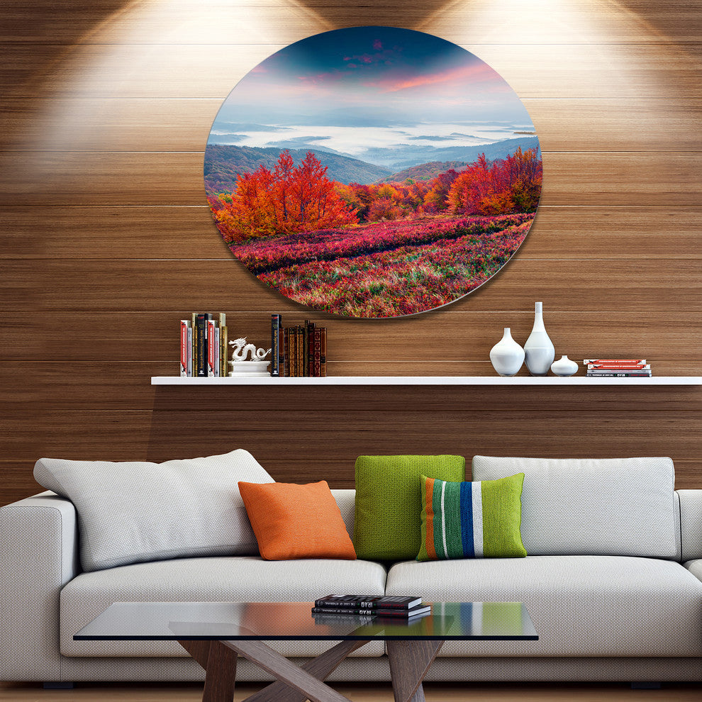 Bring Contemporary Abstraction to your home with this large Circle Metal wall art. This Autumn in the Carpathian Mountains Metal Artwork makes it the focal point of any room or office.