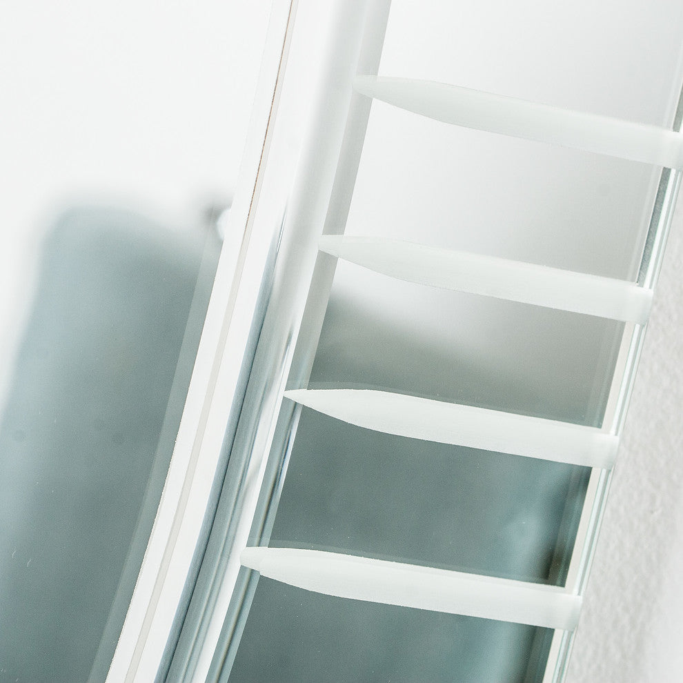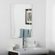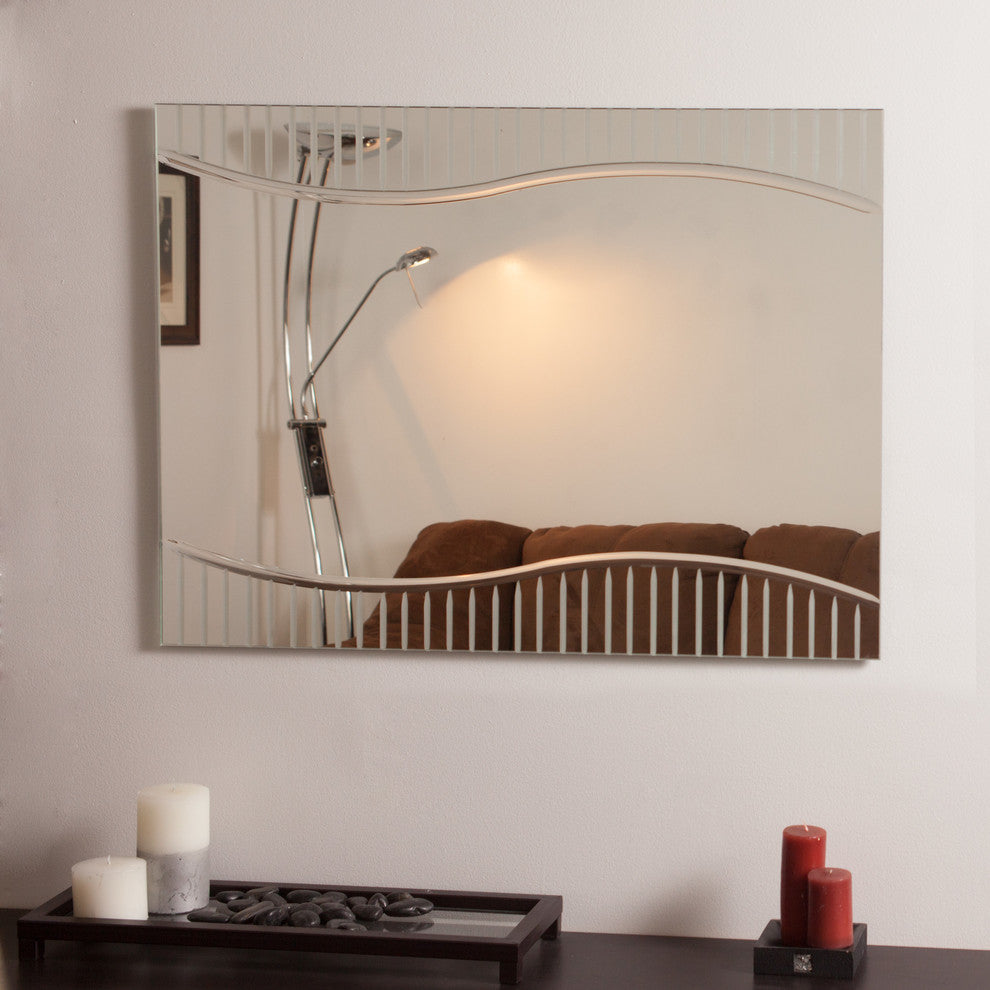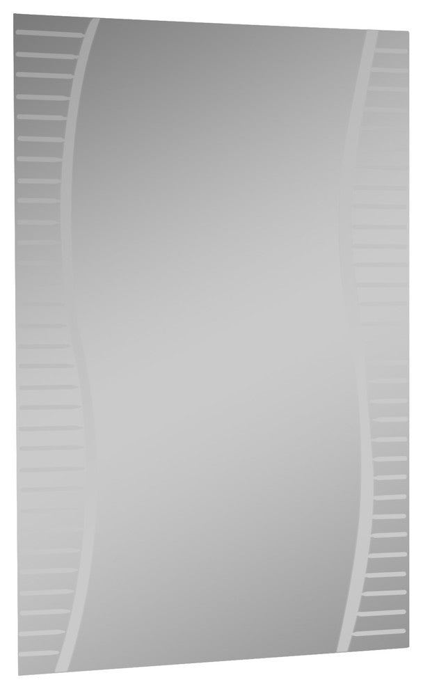 Strike a pose in front of this stylish and modern frameless bathroom mirror. Perfect for your hallway, living room or foyer as well. This mirror has a unique design with v-grooved cut and u-groove accents.- Crafted of thick, strong 3/16 glass and metal- Double coated silver backing with U-groove and vgroove accents- Mounting hardware included, comes ready to hang. Hangs vertically and horizontally.- Great for Bathroom mirror, Vanity mirror, Living Room mirror or Bedroom mirror- This mirror has a unique design with v-grooved cut glass and rounded glass. Center mirror sections is roughly 17.1"x31.5"
