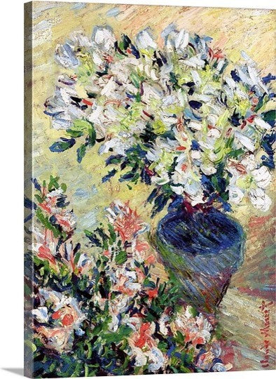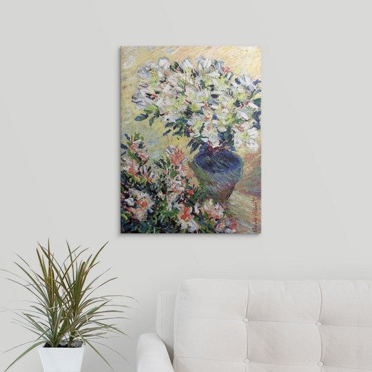 Gallery-wrapped canvas entitled, "Azaleas, 1885".A vertical painting created with diagonal brush strokes and movement of flower blossoms in a ceramic planter by an Impressionist master.Our wrapped canvases feature a proprietary design that prevents warping or sagging over time. By using archival inks and artist-grade canvas, our premium canvases are sure to add that extra touch to any space. Lastly, our canvases are finished with a closed back that incorporates pre-installed hanging hardware for easy installation.