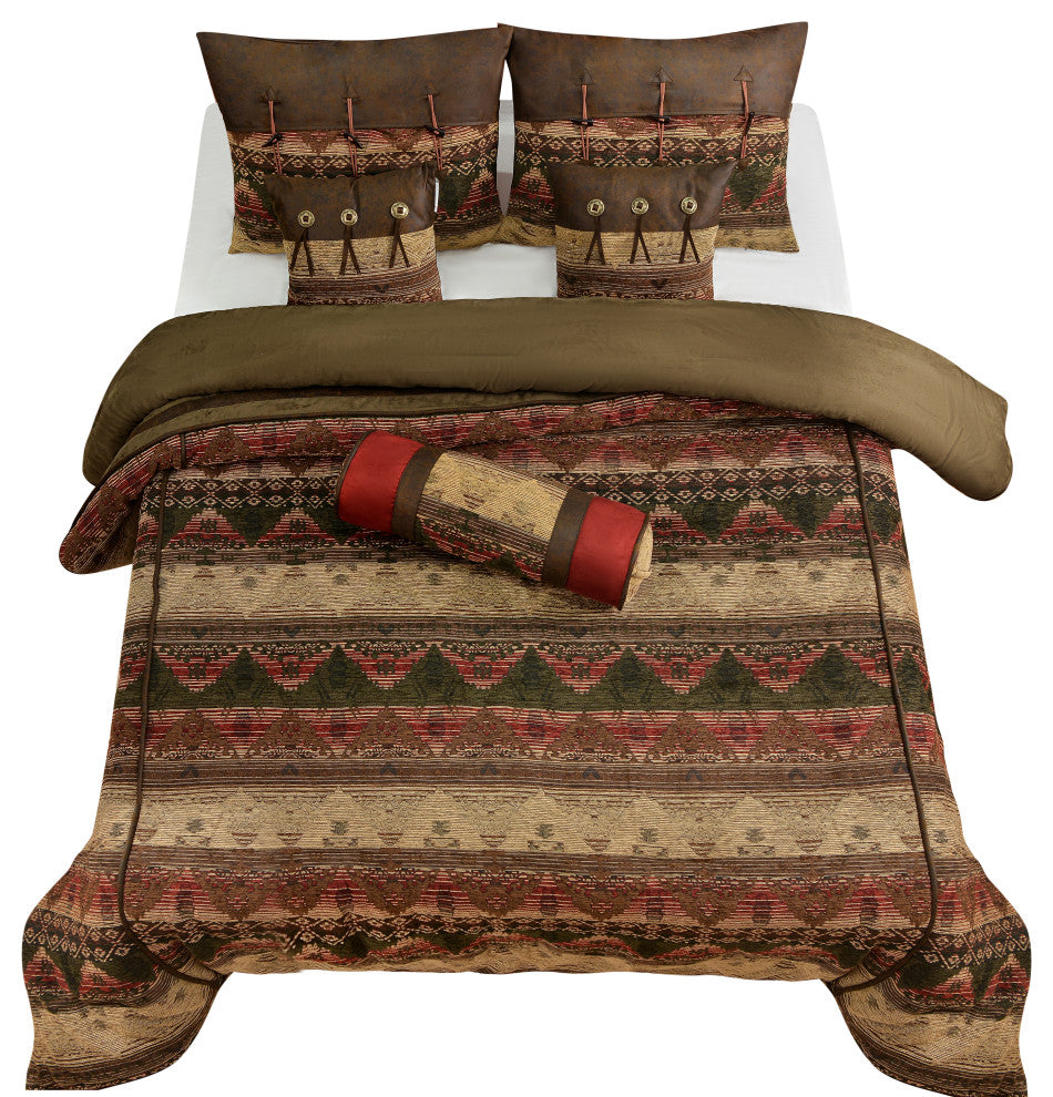 Geometric patterns and rich hues of almond, cocoa, charcoal, and carmine are featured in rich chenille and paired with charcoal and carmine faux suede to create the Aztec Southwestern Chenille Suede Bed Sets. Bed set includes comforter, one bed skirt, two pillow shams 21" x 27" (twin has one; king has two 21" x 34" shams), two 16" x 16" throw pillows (twin has one), and one 8" x 21" neck roll.Bedding Details:•Twin: Comforter 68" x 88"; bed skirt 39" x 76" + 16" drop. •Full: Comforter 80" x 90"; bed skirt 54" x 76" + 16" drop.•Queen: Comforter 92" x 96"; bed skirt 60" x 80" + 18" drop.•King: Comforter 110" x 96"; bed skirt 78" x 80" + 18" drop.•Dry clean only.•Comforter face is 100% polyester, back is 100% cotton, filling is 100% polyester.•Bed skirt: 100% polyester.•Pillow shams: 100% polyester. •Decorative pillows: 100% polyester. •Additional coordinating accents and decor available separately.