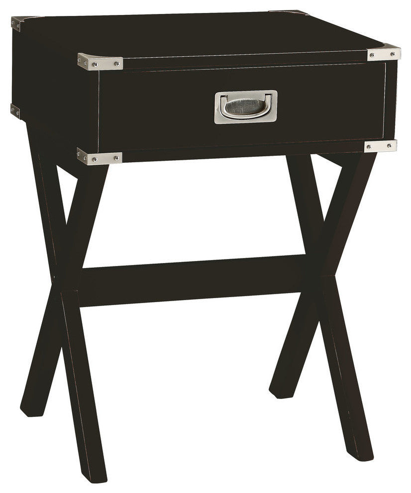 Bring the vintage charm of campaign style into your home with the updated Babs End Table. Hardware on each corner and a flush-mount drawer pull stays true to the classic luggage-inspired design, while a bold black finish freshens and renews it. Dimensions: W 18" x D 16" x H 24"Finish: Black