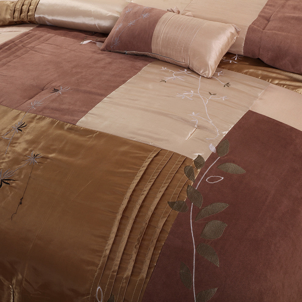 Back To Nature will bestow an elegant and luxurious naturalfeel to your bed. Floral embroideries combine with faux silk and faux suede to provide a luxurious look normally found only with the most expensive of comforter ensembles. The comforter and shams are overfilled with high quality soft polyester, and each size is given a few more inches to be sure the bed is well covered. Set contains: One Comforter, Two Shams ( 1 with Twin), 1 Bedskirt, and 3 Decorative Pillows.