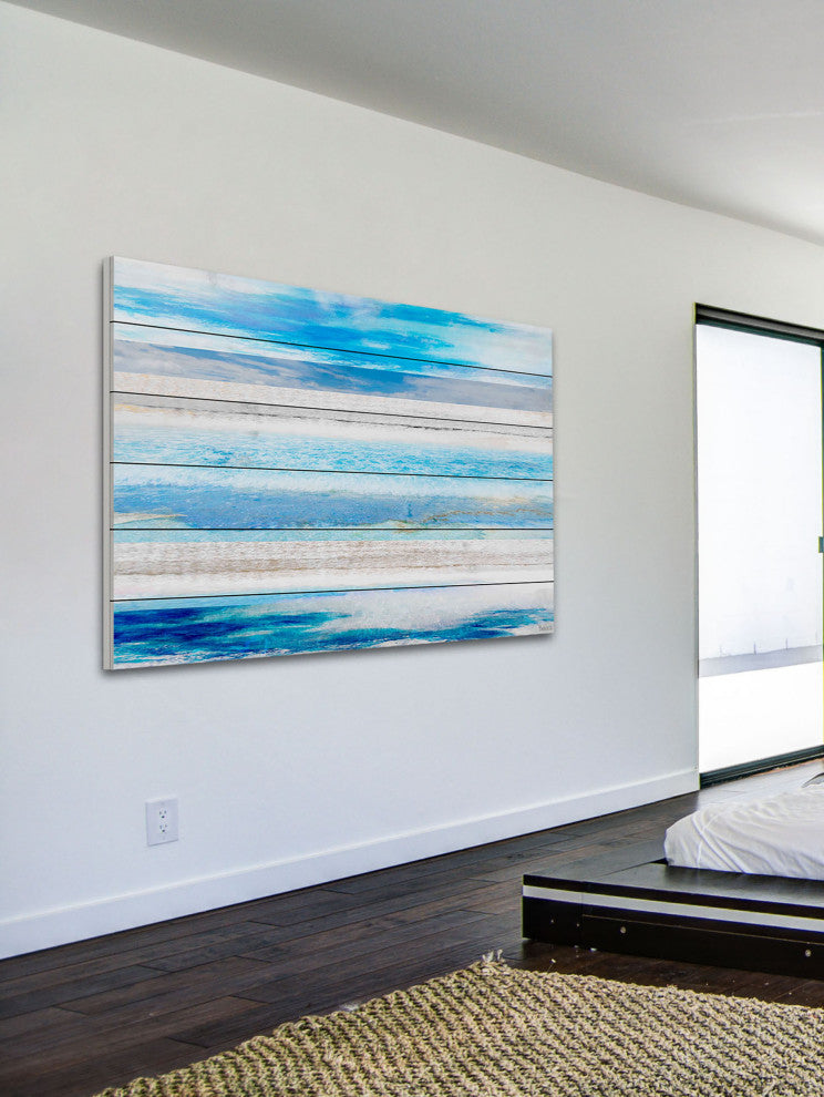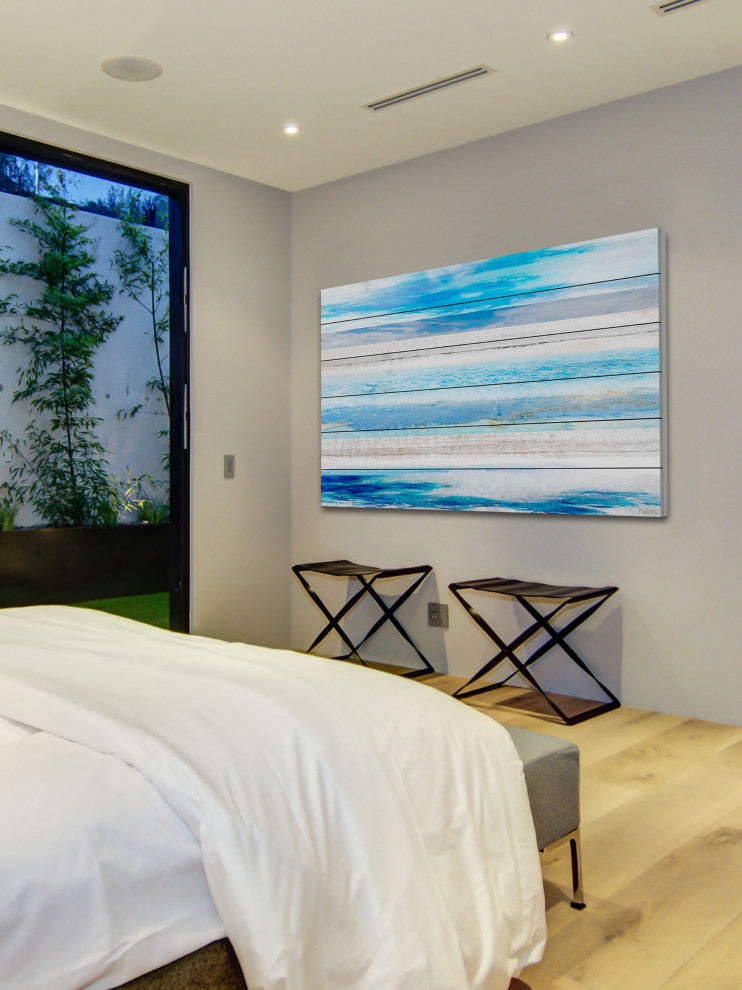 Striking and unique, the "Baia Azul" Print on White Wood by Parvez Taj will bring your walls to life. Printed on white wood, this 60 inch wide by 40 inch tall contemporary artwork will make a statement in any living room, dining room, or bedroom.- Fine art UV ink print on white wood by Parvez Taj- wood pieces are hand-selected by Fine craftsmen for printing- Arrives ready to hang- Includes a certificate of authenticity- Artist signature on the front