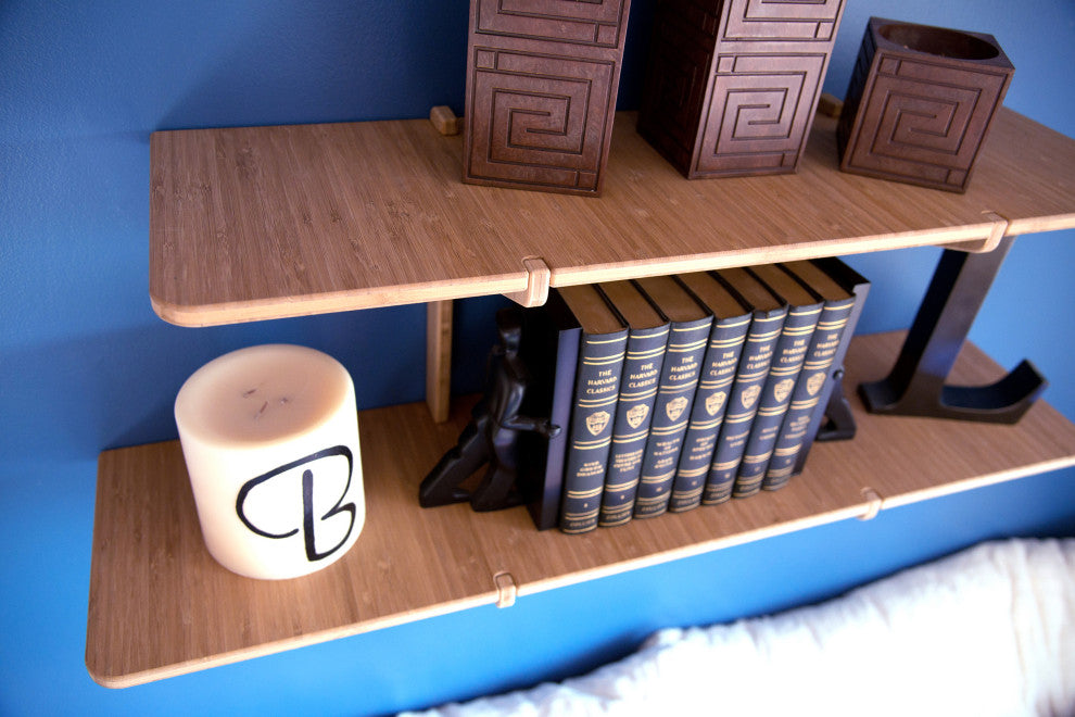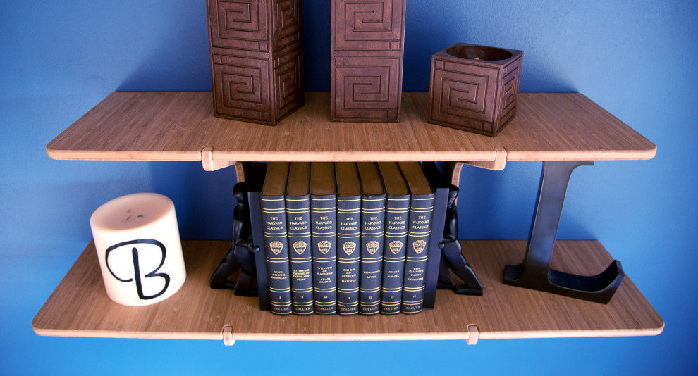 Two shelves for the price of two. Made entirely from incredibly strong and beautiful bamboo, The Double Shelf will help organize and accent any living space! Unlike most floating shelves, the this system can hold some serious weight.Made from strong, gorgeous 1/2" bamboo.Holds up to 75 lbs.Grassracks'' Easy installation Mounting SystemInterchangeable with other Grassracks productsMade in USAEco-FriendlyPieces Included: 2 Cradles, 3 Shelves, 1 Mounting Bar, 1 Hardware PackageProduct Care: Treat as normal finished wood product. Keep away from humid conditions and extreme temperatures. If the product is exposed to moisture, wipe dry immediately.Product Warranty: 2 Year Warranty