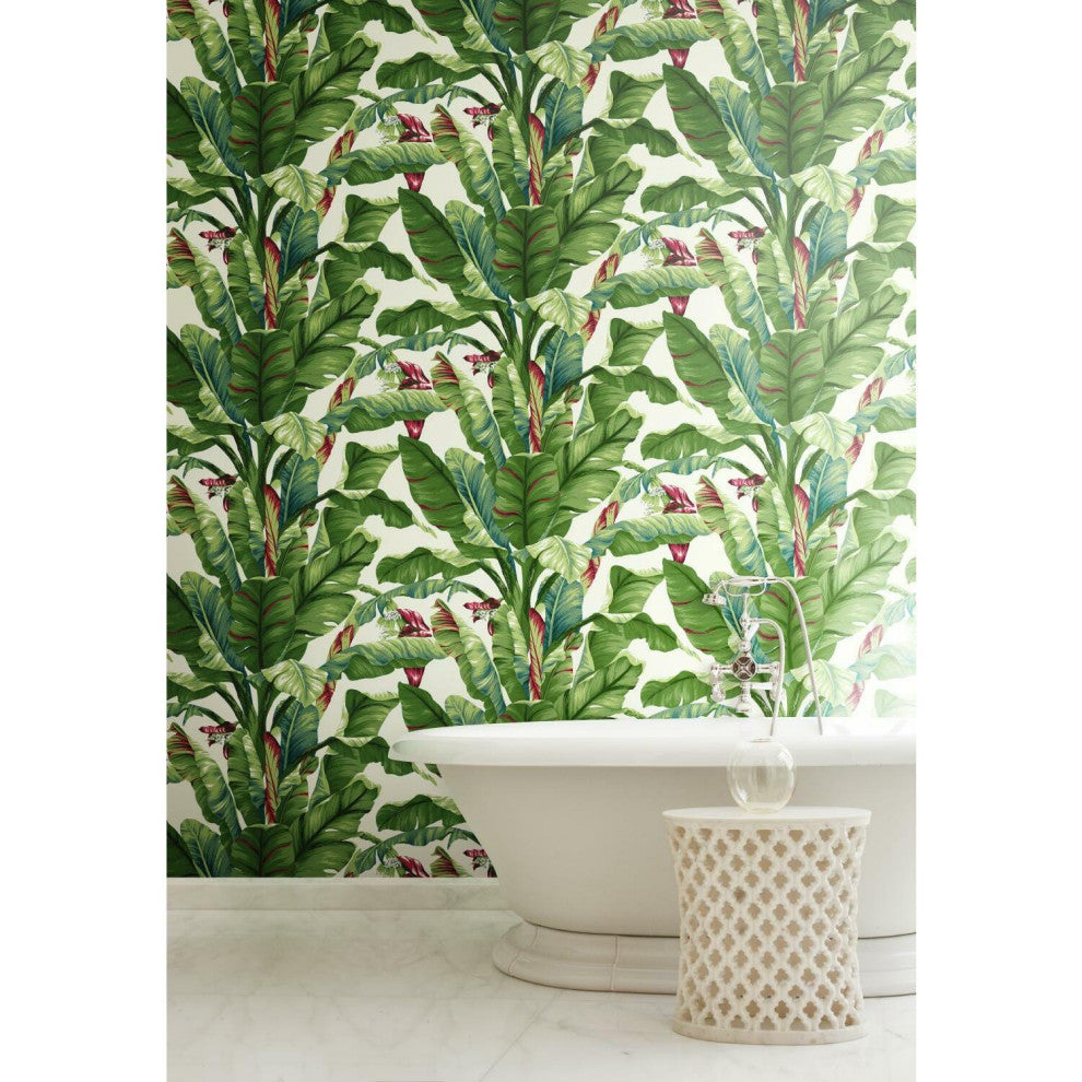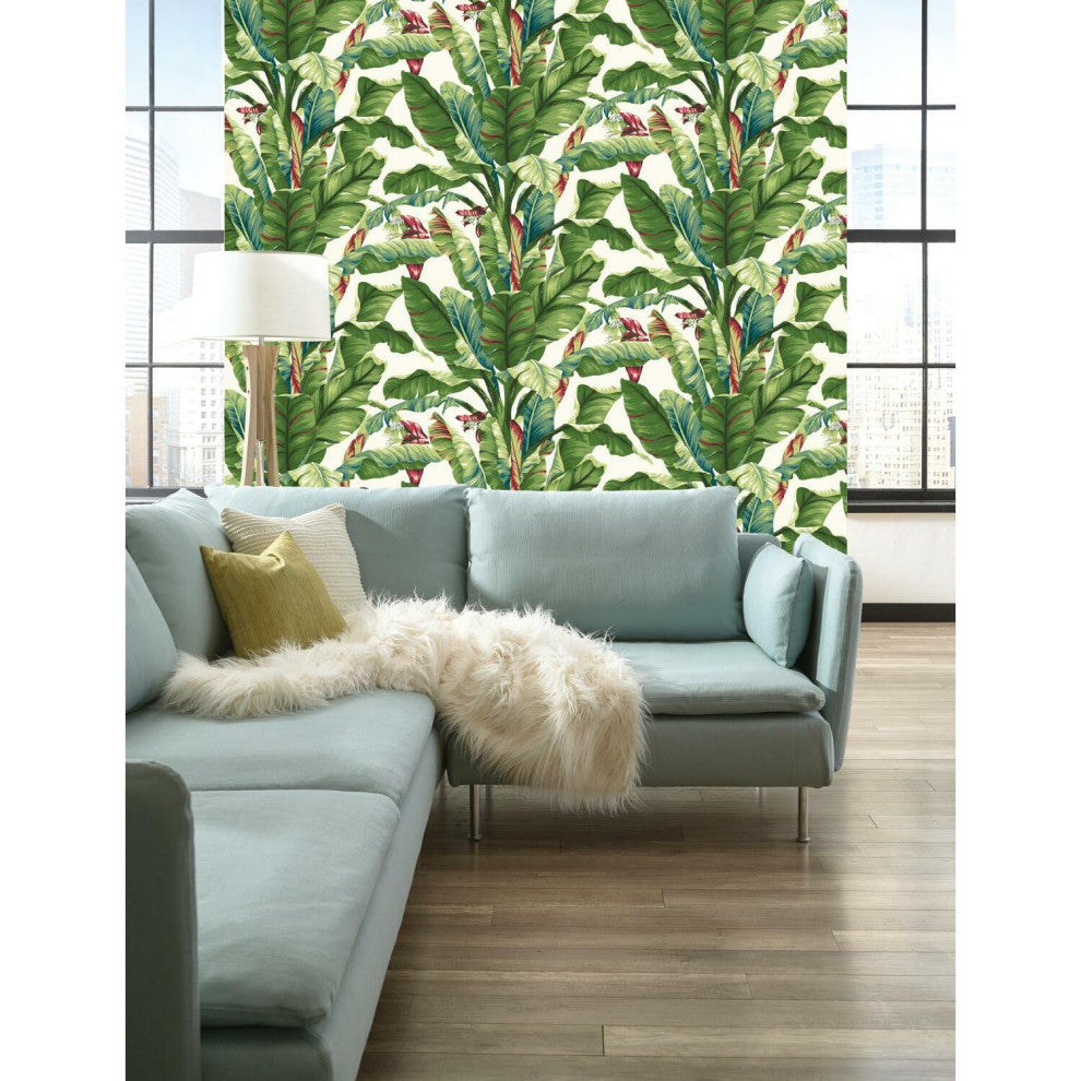 Tropical style is much more than untamed gardens of exotic beauty. It is the embodiment of modern affluent lifestyle and leisure. Manufactured on Sure Strip, a unique high performance substrate, this ultra-easy removable wallpaper is guaranteed easy to install and easy to remove; simply use water to activate. The flowering palms of pattern Banana Leaf sway in tropical breezes, invoking memories from a classic age of glamour. Includes 1 roll - 27 in x 27 ft = 60.75 sq ft with a drop match and 25.25 in repeat.