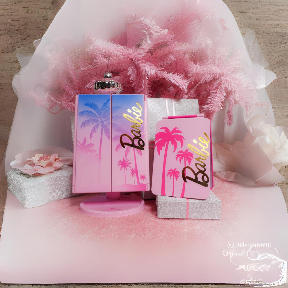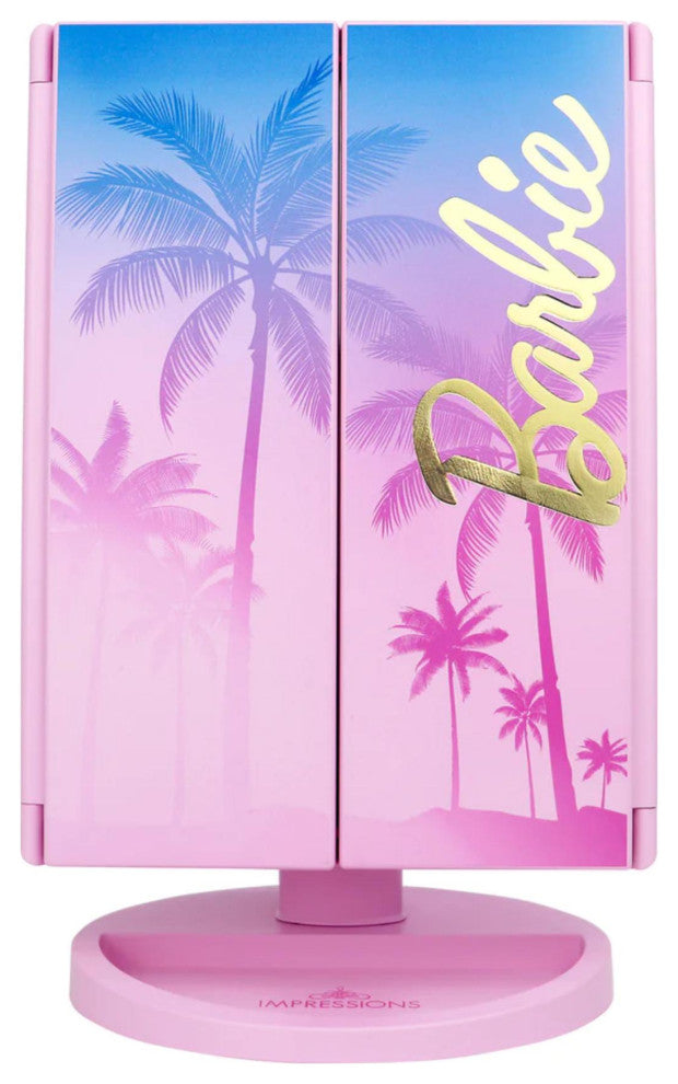 Impressions Vanity presents Barbie Makeup Mirror with magnification. It is a must have for every beauty enthusiast. Elevate your beauty routine with this chic and functional mirror, designed with the iconic Malibu Barbie print and a touch of gold foil for a glamorous touch. Unleash your inner glam goddess with the palm tree and Barbie signature adorning the cover, making this mirror a statement piece for your vanity. Illuminate your beauty space with the built in strip LED featuring three adjustable lighting temperatures. The front facing soft touch sensor switch allows for effortless control tap to turn on and off, or hold down to achieve your desired level of brightness. Whether you''re going for a natural daytime look or a sultry evening vibe, this mirror has you covered. Experience precision in your skincare and makeup application with the 2X and 3X magnification side panels. Customize the mirror angle to suit your sitting position, ensuring every detail is perfected. The portable and lightweight design makes it your ideal travel companion and the cordless power system ensures you can glam up anytime, anywhere. Upgrade your beauty routine with the Malibu Glam Makeup Mirror where functionality meets fabulous. Unleash the power of perfect lighting and magnification, all wrapped up in a stylish package that reflects your unique beauty. Transform your vanity into a beauty haven with this stunning makeup mirror.
